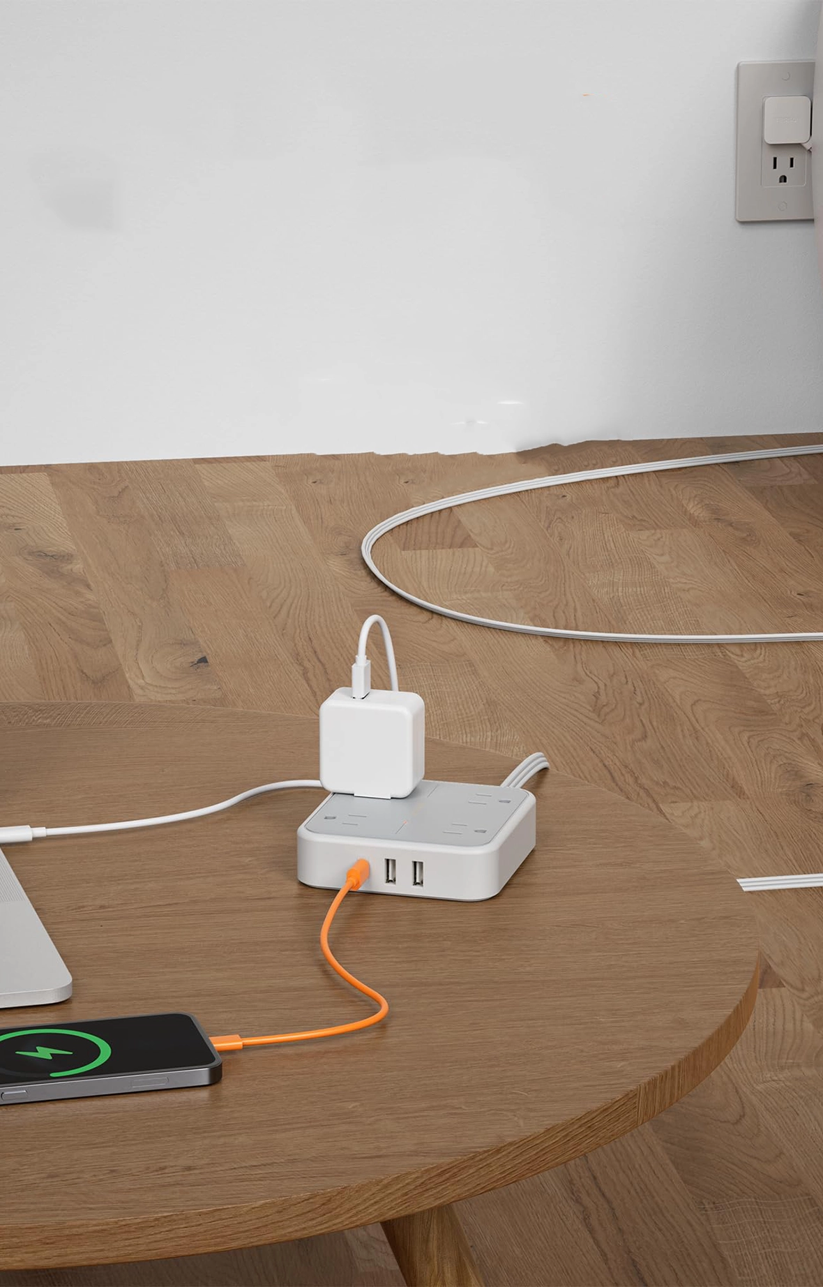 10ft clamp surge protector with 5 outlets, 4 USB ports (2 USB-C), and flat plug design for home, office, dorm, or gaming setups.