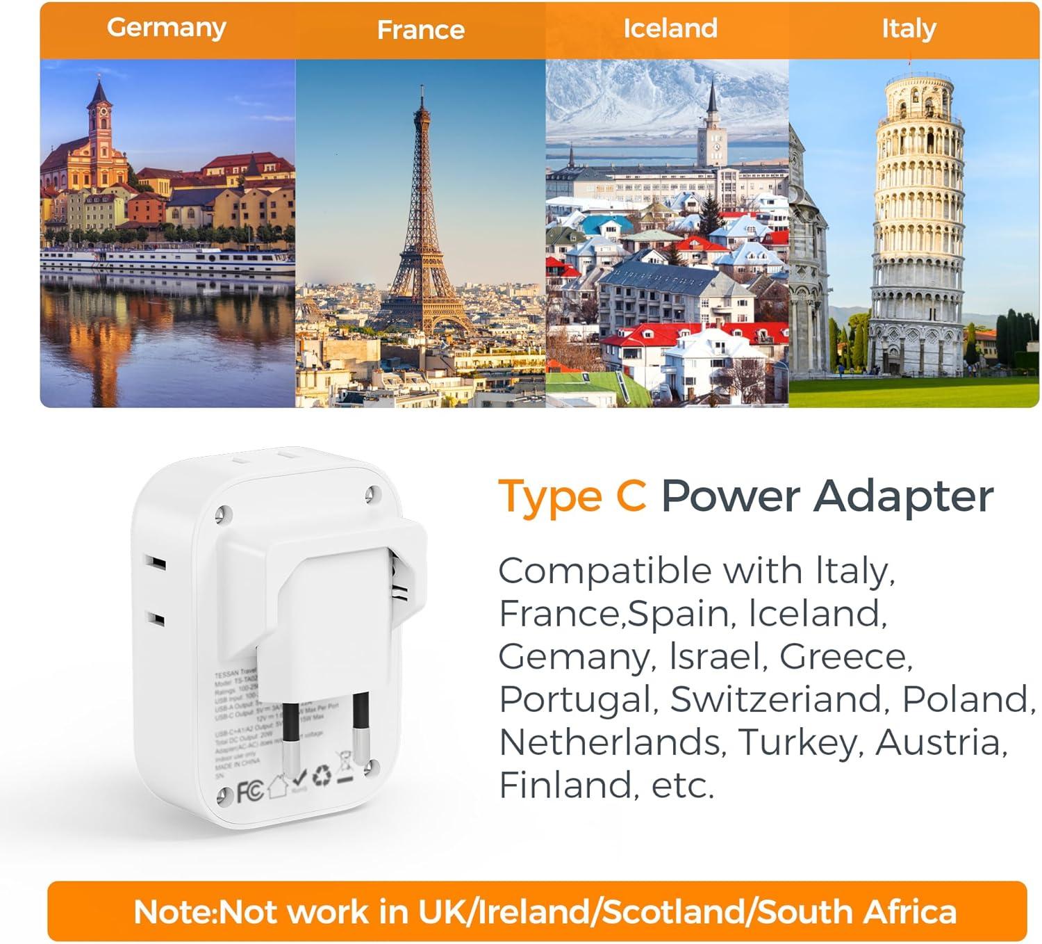 European Plug Adapter: The type c plug adapter compatible in most European countries such as Austria, Belarus, Belgium, Croatia, Denmark, Finland, France, Germany, Greece, Hungary, Portugal, Poland, Netherlands, Spain, Turkey, Italy; More country list can be checked in description