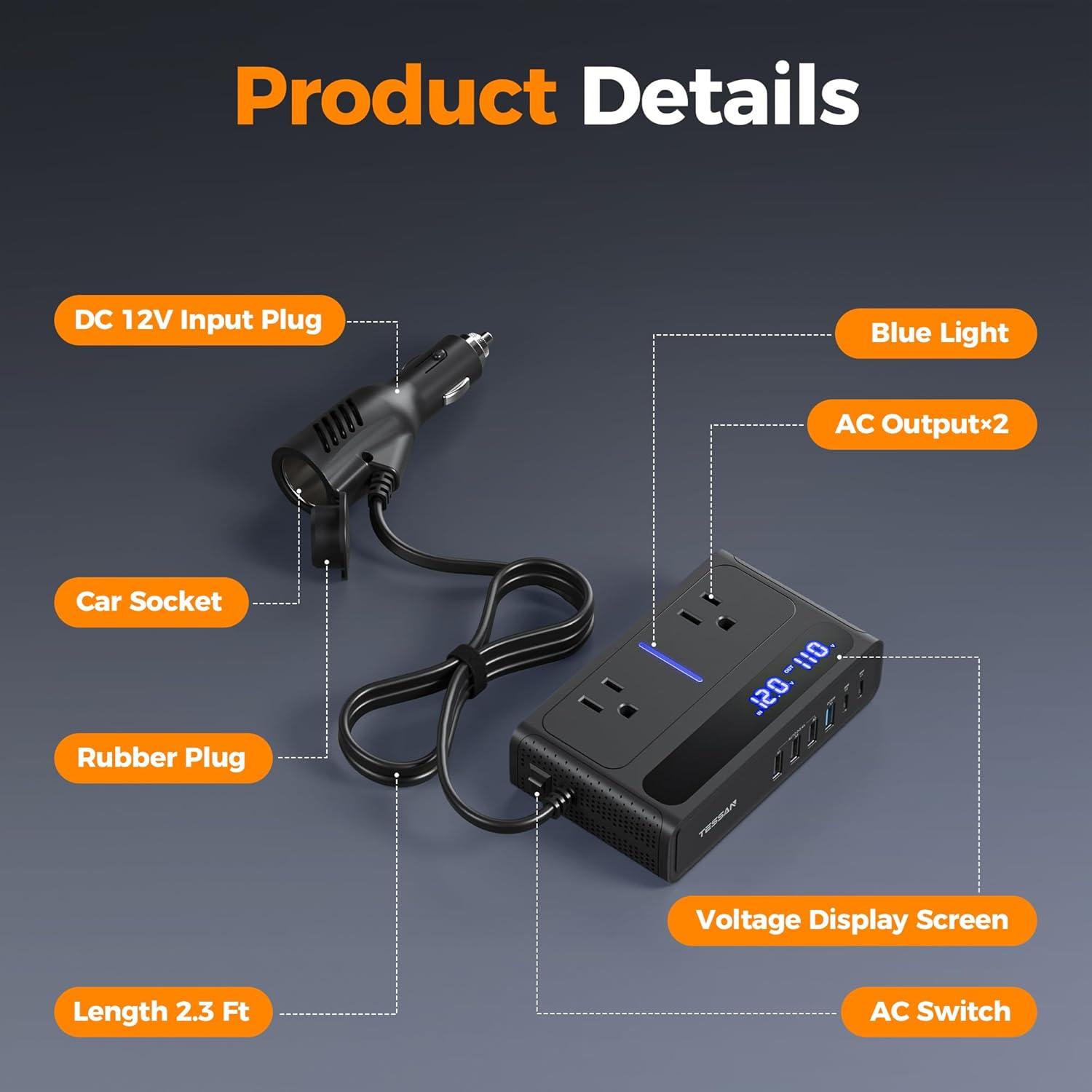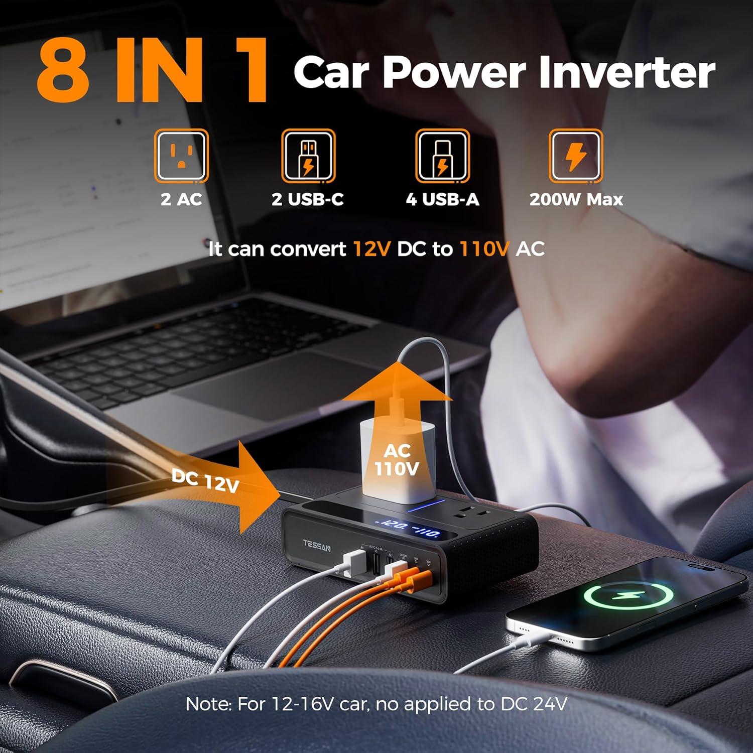 8 IN 1 200W Car Outlet Adapter: It can convert 12V DC to 110V AC. Support 12V (regular vehicles) and 16V (Tesla produced after November 2021) cars. It features 2 AC outlets and 6 USB (2 USB-C, 4 USB-A) ports, suitable for laptops, mobile phones and tablets. Car essentials accesories for road trip, camping and working