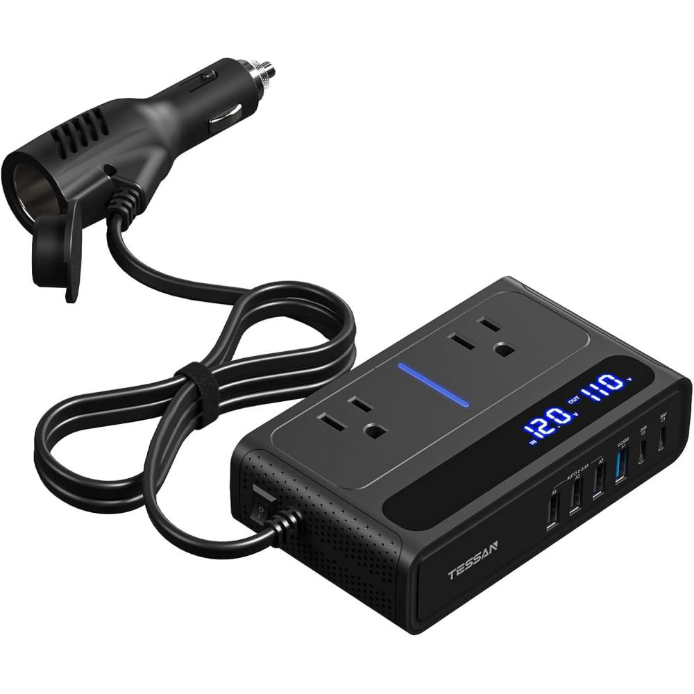 200W Car Power Inverter, TESSAN 12V DC to 110V AC Converter with 2 AC Outlets and 6 USB Ports with 36W USB-C, Car Charger Adapter PD/QC 3.0 Fast Charging, Car-Essentials for Camping, Road Trip, Black(36W)