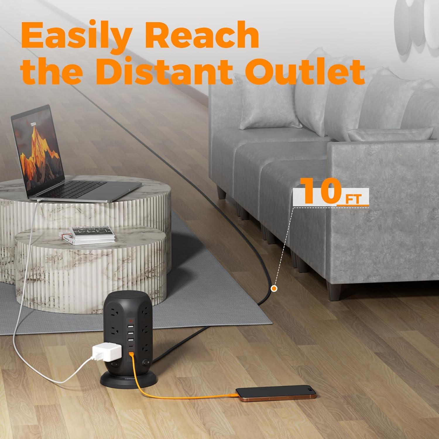 Flat Plug Extension Cord 10ft: Tower power strip 10ft allows you to reach distant power outlets; The 0.31in ultra thin flat head can be used in tight spaces like behind TV or sofa; The 45 degree right angle design doesn't block the outlet below