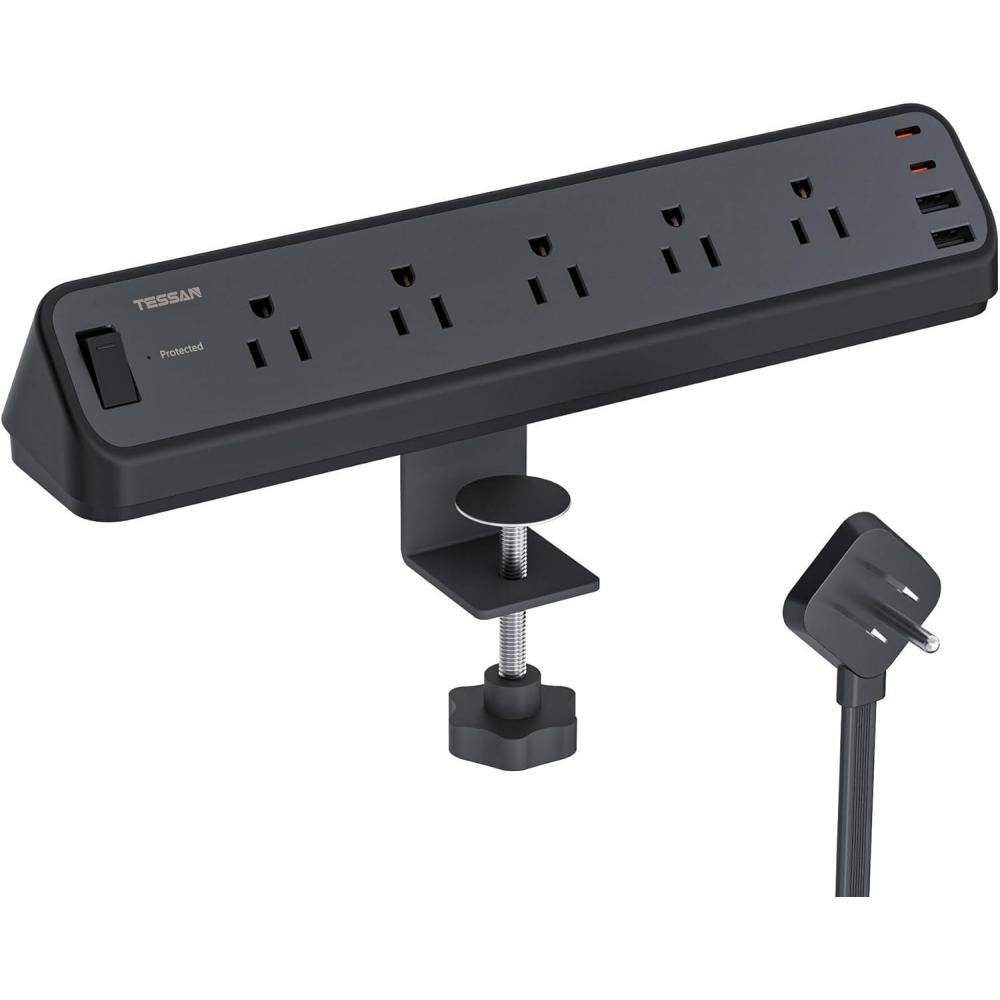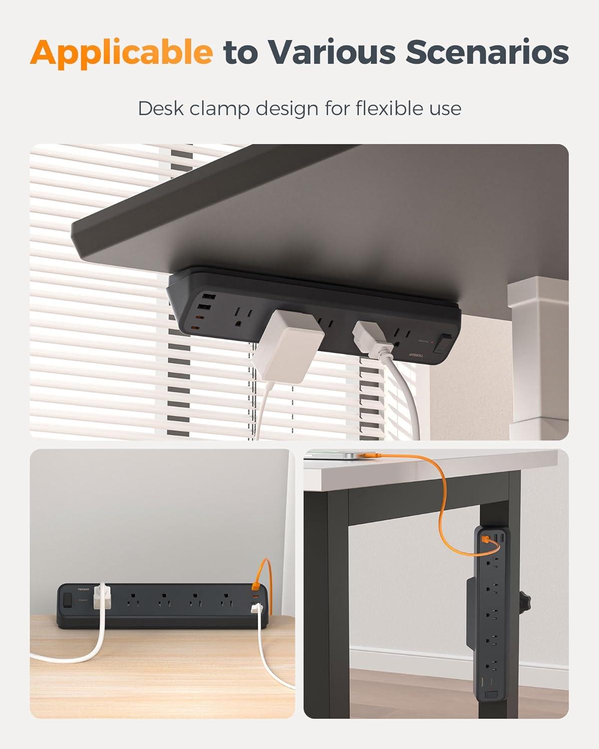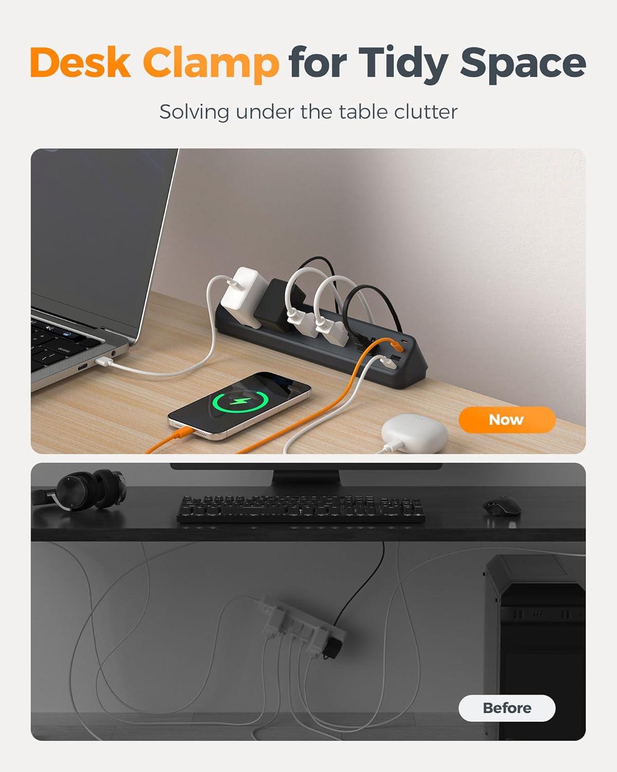 Desk Clamp-on Design: This desk mount power strip securely mounts to desktops, under desks, or table legs (fits max thickness up to 2 inches), keeping your plug extension outlet stable and providing easy access to charging for your devices