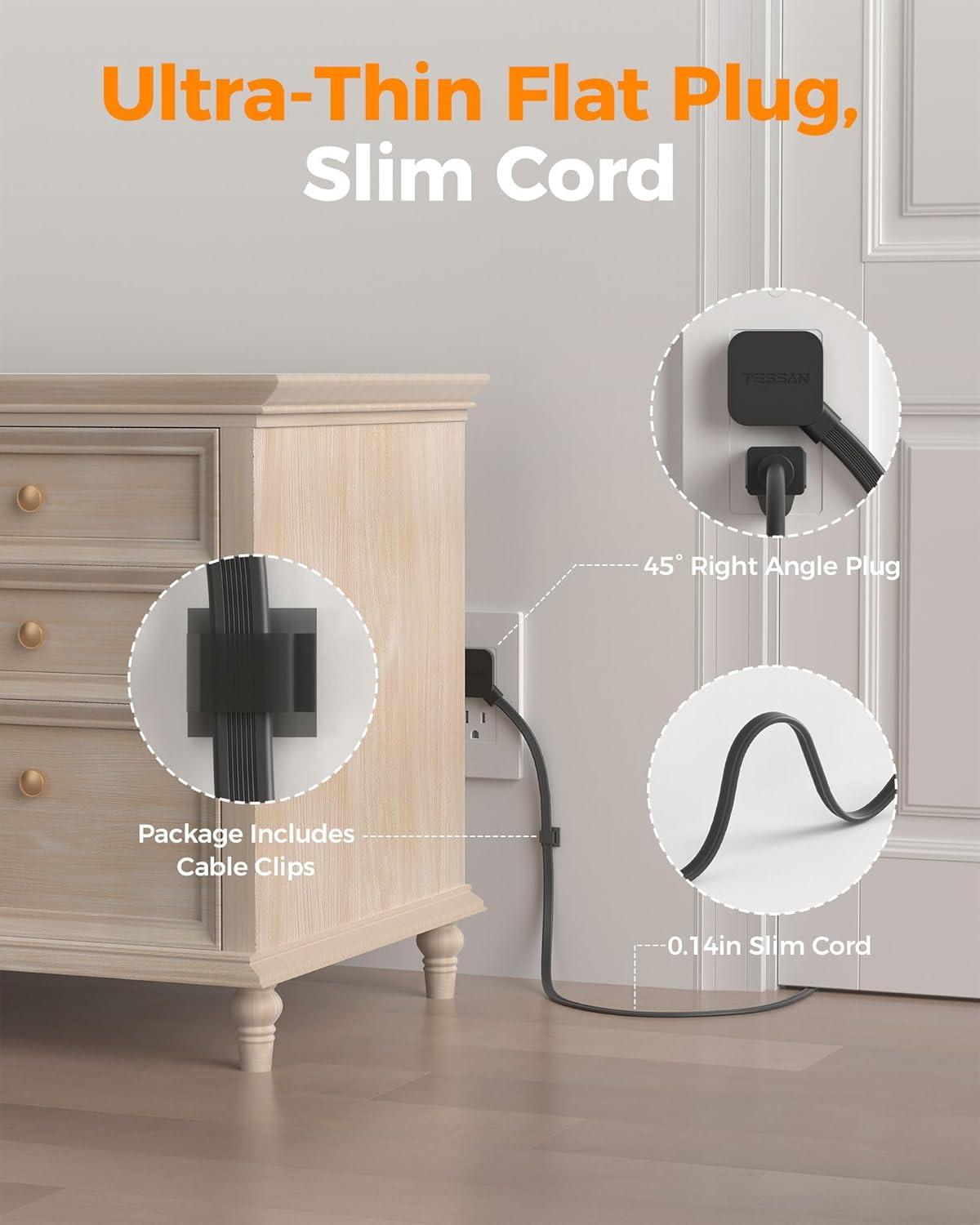 Flat Extension Cord 10Ft: The 0.31 inches deep design fits easily into tight spots, like behind sofas, beds, and cabinets for saving space; The 45 degrees right angle flat wall plug won't block the bottom receptacle of your duplex outlet