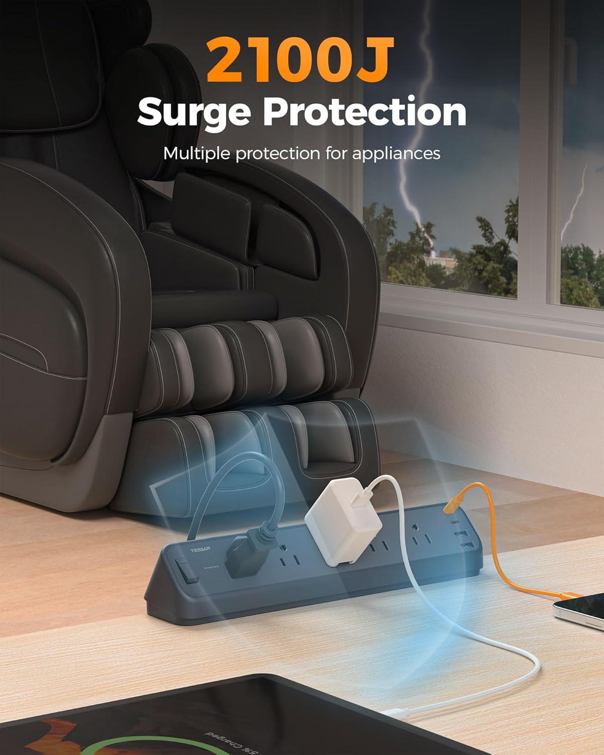2100J Surge Protector Power Strip: Features overload protection, short-circuit protection, and over-current protection; The on/off switch automatically shuts off when protections are triggered, safeguarding your devices during charging