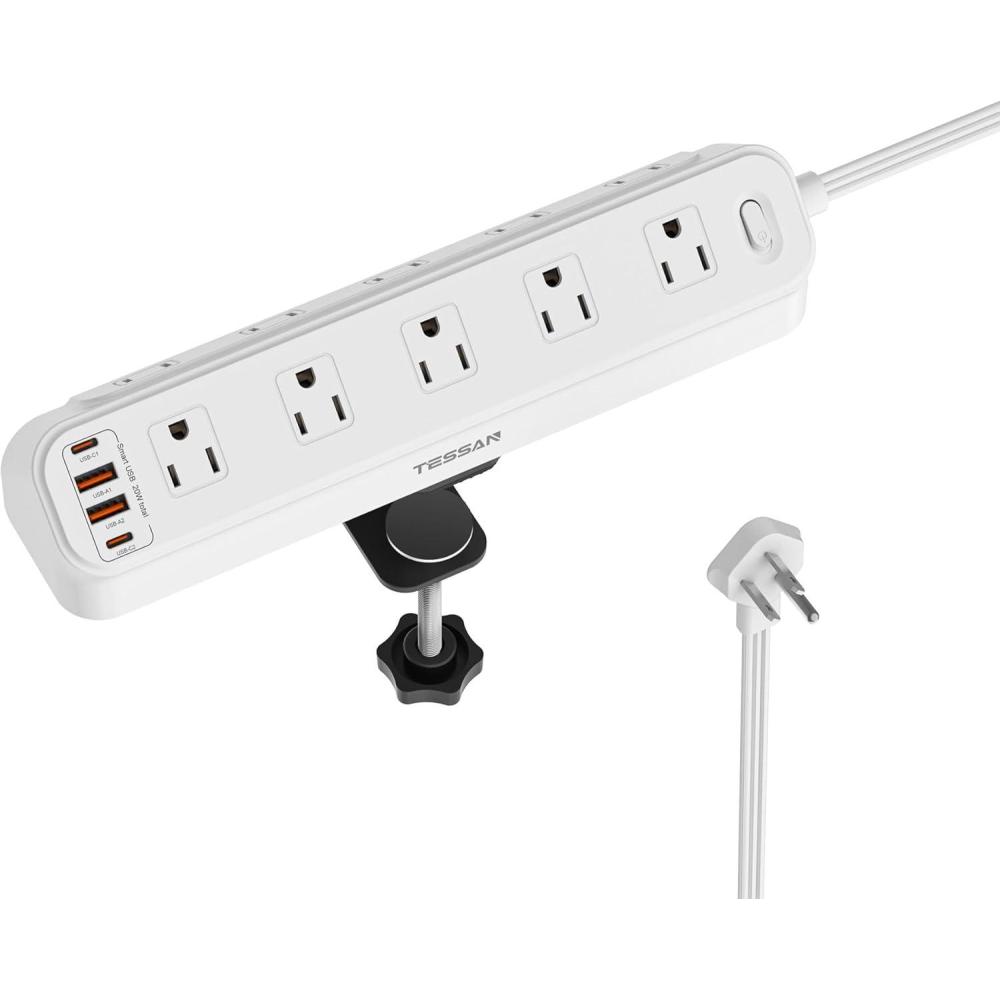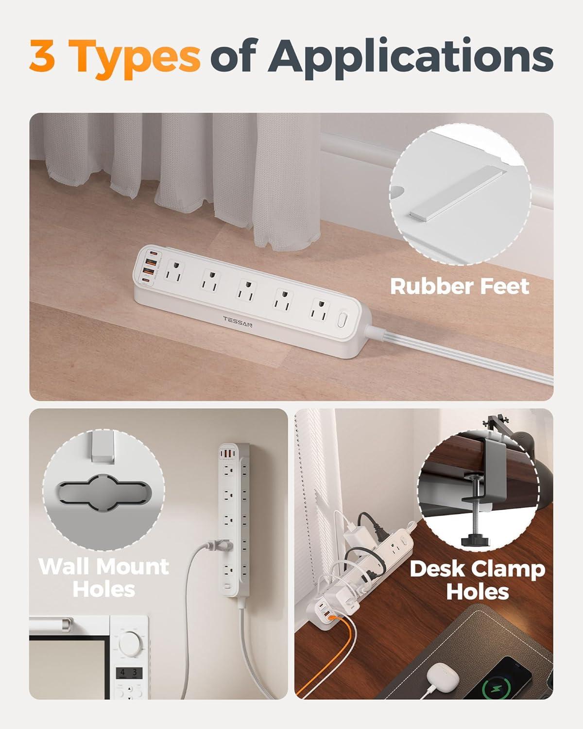 Mountable Power Strip: It can also be hung on the wall by choosing not to install desk clamp components; 2 mounting holes allow it securely installed in various applications; 2 rubber strips at the bottom efficiently keeps it from slipping and sliding