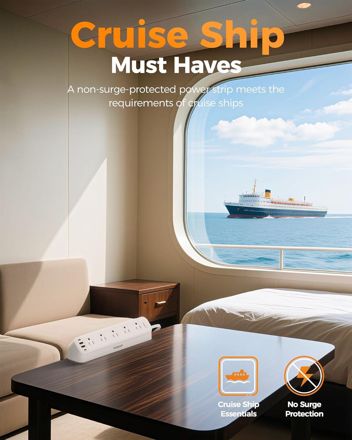 Cruise Acceptable Power Strip: Without surge protection, this flat outlet extender is absolutely cruise accessories must haves; The flat plug extension cord fits easily in luggage or backpacks—practical for travel essentials without bulk