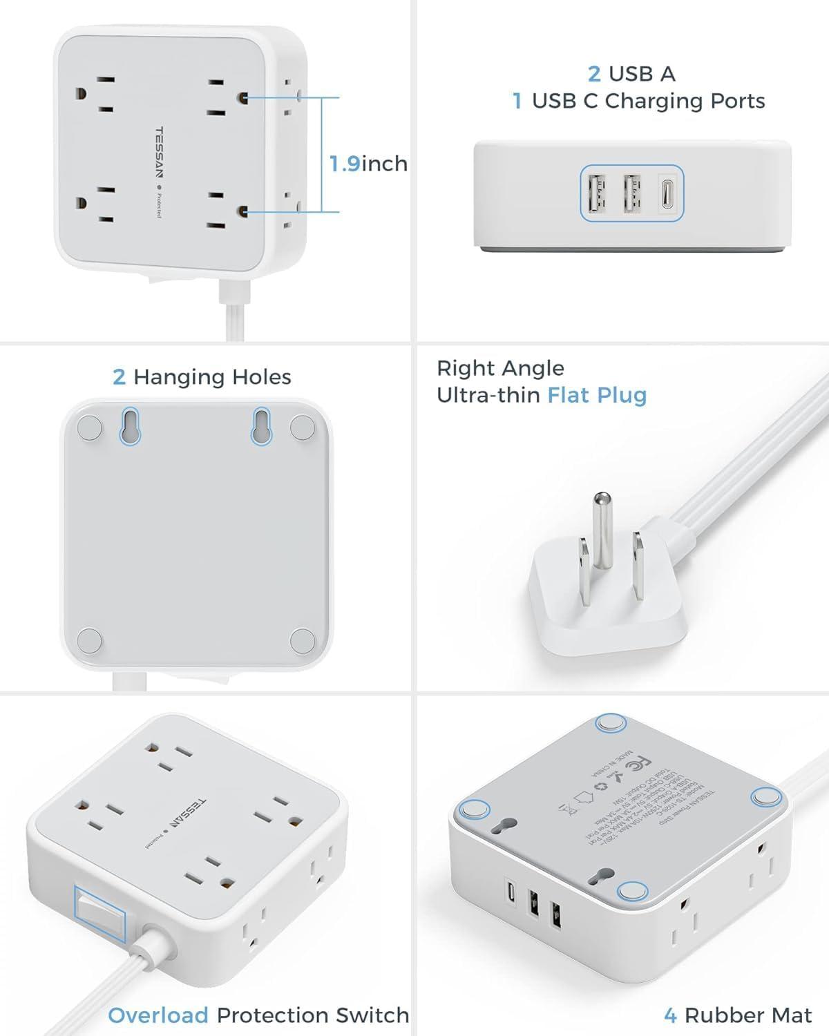 Power Strip with USB C: Dual USB A ports features 2.4A, the USB C port features 3A; 2 types of USB ports can detect charged devices and deliver optimal charging speed, giving you more charging options; idea for USB devices like cell phone, tablet, earphone, etc