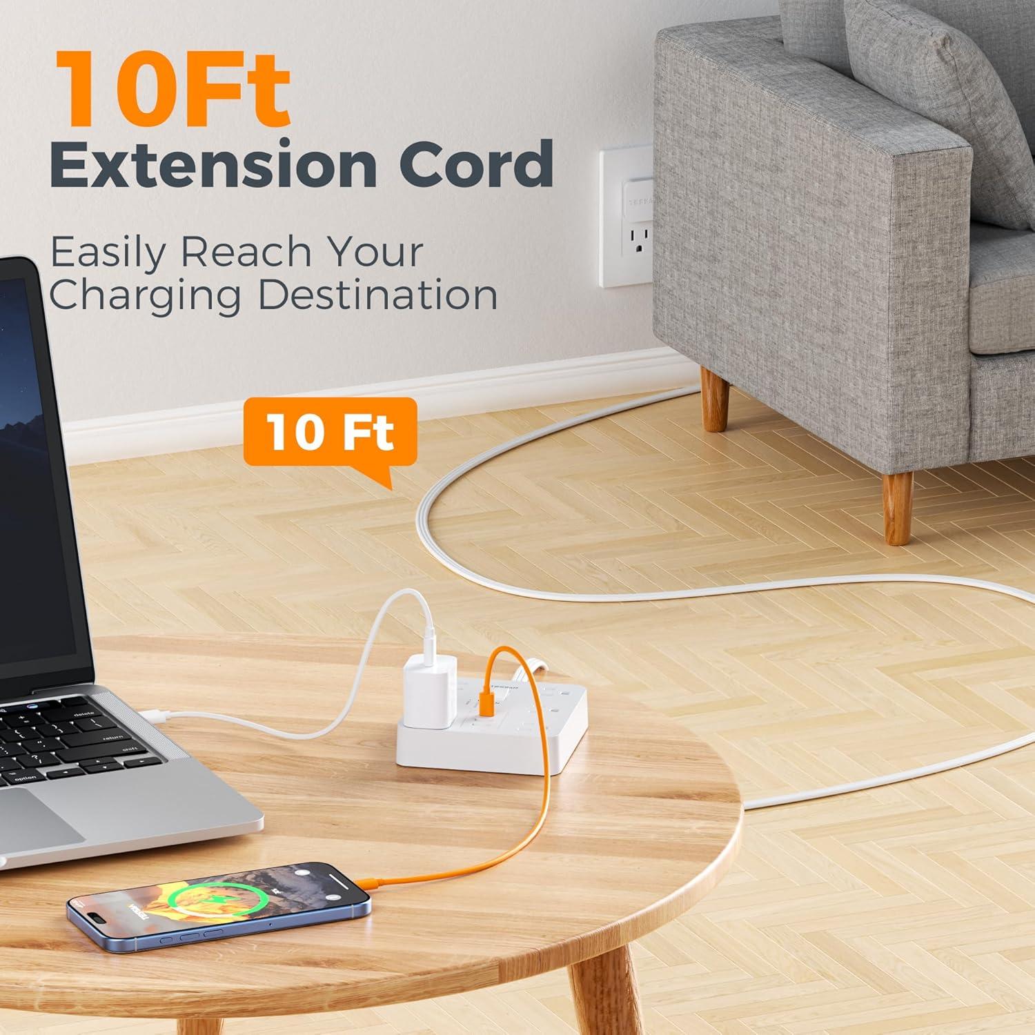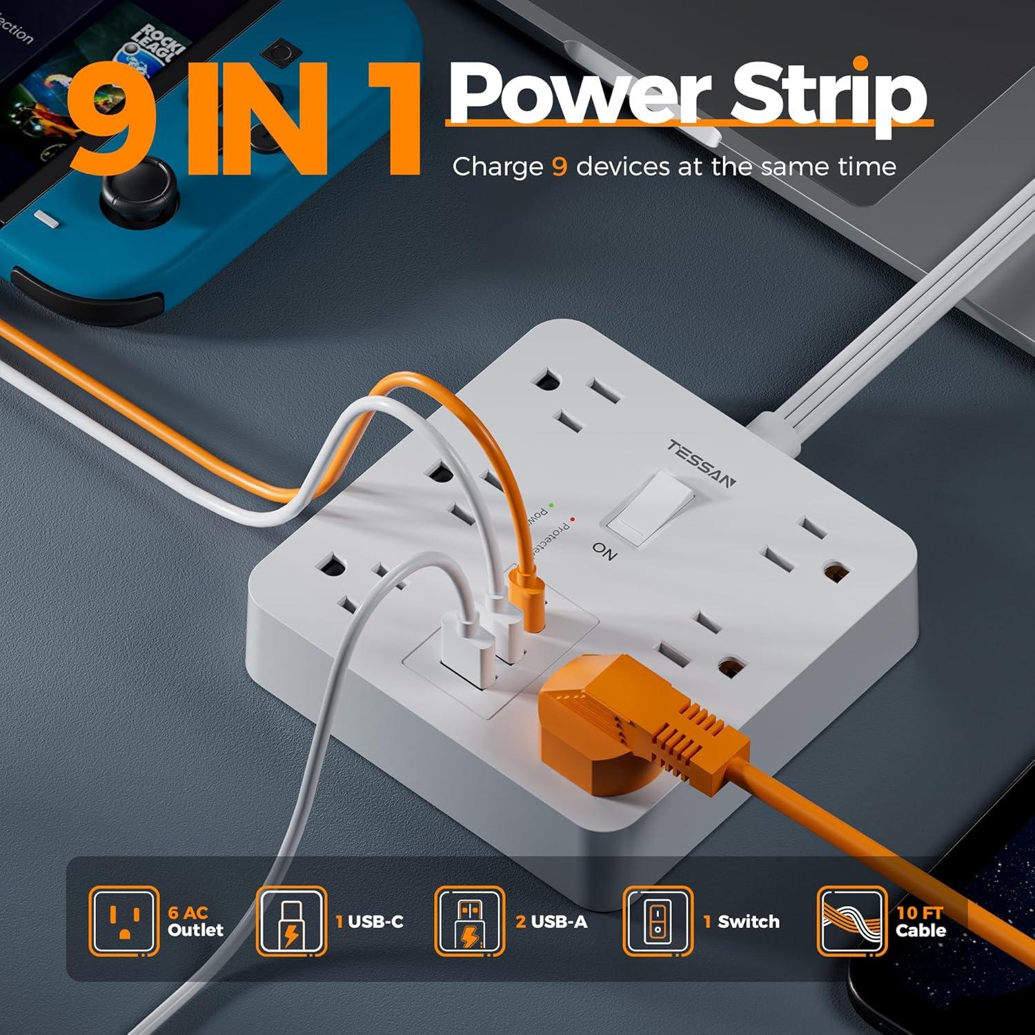 Extension Cord with Multiple Outlets: 6 widely spaced AC outlets are separated enough to fit big plugs and have 3 USB ports that could charge up to 9 electrical devices simultaneously without blocking each other; Could be as a desktop power strip to make your various needs