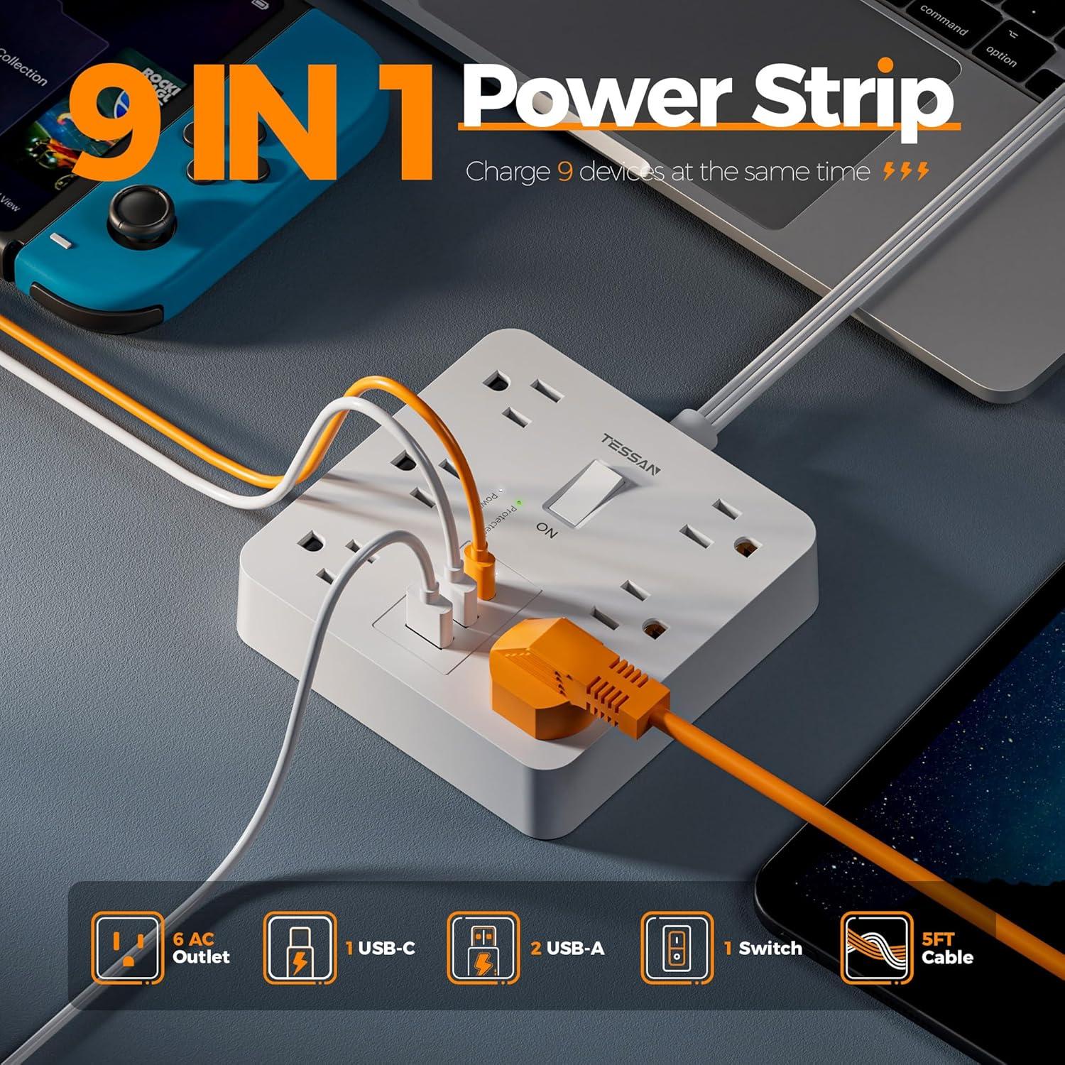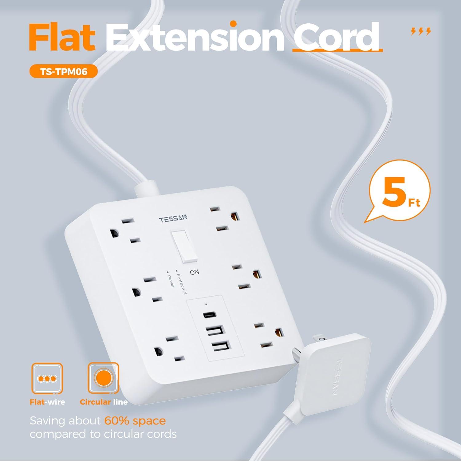 imageFlat Plug Power Strip Bundle TESSAN 5 ft Ultra Thin Extension Cord with USB Wall Charger Slim Desk Charging Station Compact for Travel Cruise Ship and Dorm Room Essentials