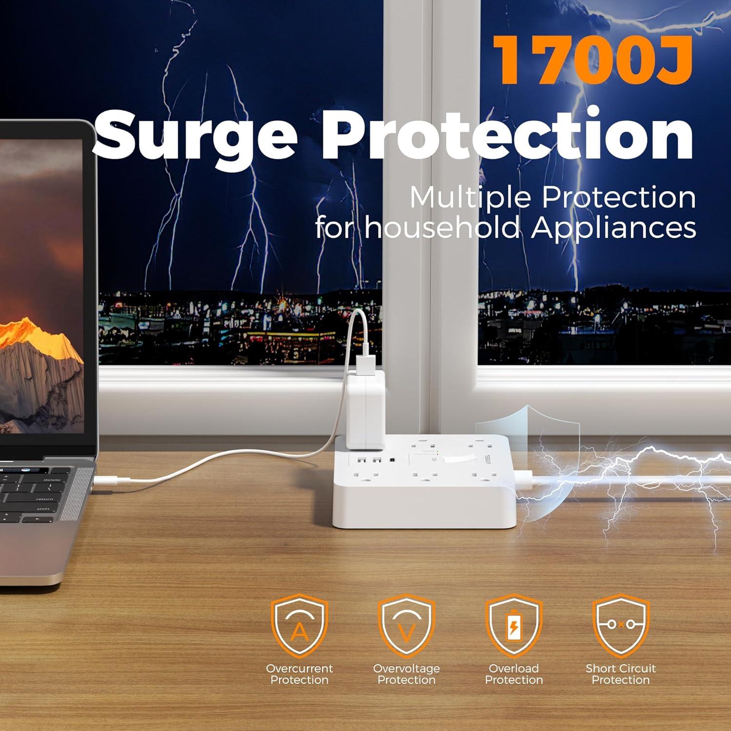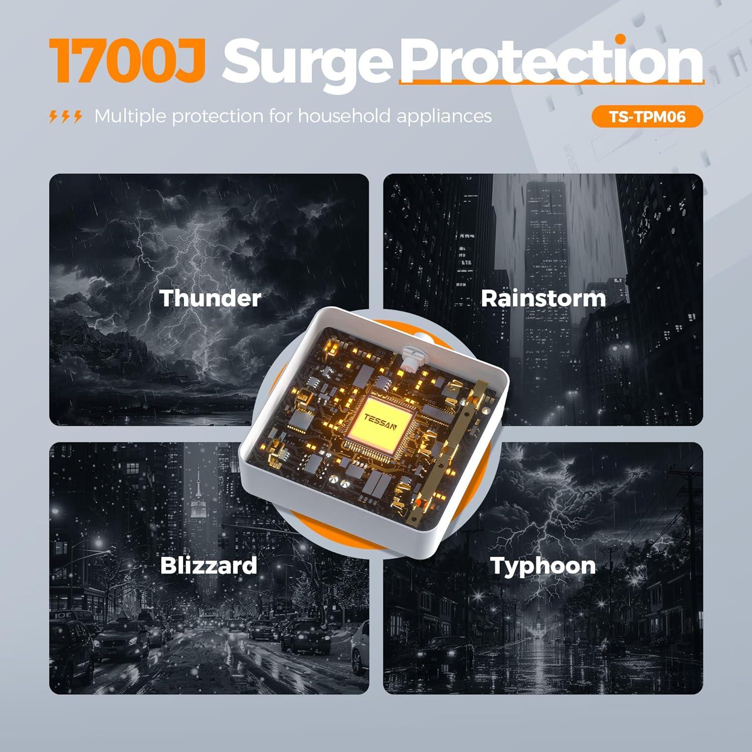 1700J Surge Protector: This power strip surge protector built-in 1700 joules protection reliably protects your electrical appliances from lightning, power surges, and spikes; An integrated circuit breaker enables you to trip off automatically when your rated power exceeds 1625W to make this outlet strip from circuit overload