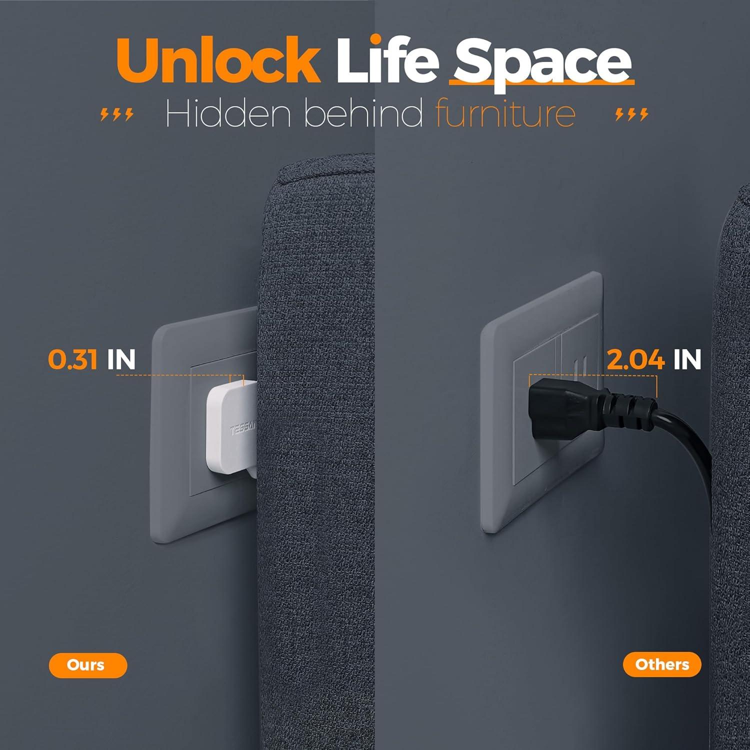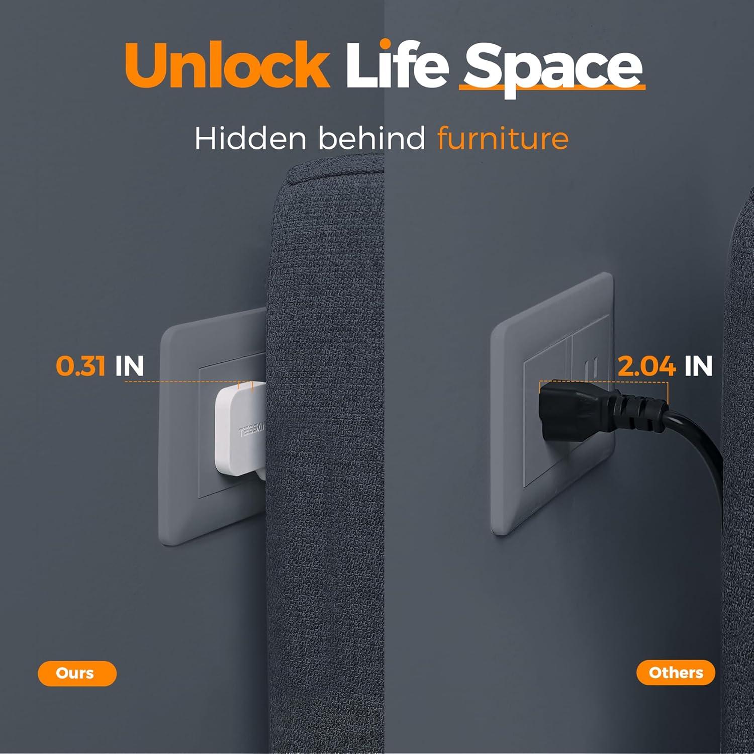 15ft Flat Extension Cord: The long power strip 15 ft cord flexibly provides sufficient cord length to cover your outlets to reach the remote places such as living room, office; 45 degree convenient space-saving low profile flat head fits in tight spaces like behind furniture, bookshelves, desks or anything
