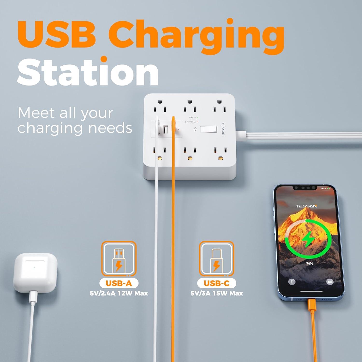 imageFlat Plug Extension Cord 15 Ft TESSAN Surge Protector Power Strip with 6 Outlets and 3 USB 1 USB C Ports 1700J Protection Desktop Black Long Power Cord for Indoor Home Office School Dorm RoomWhite