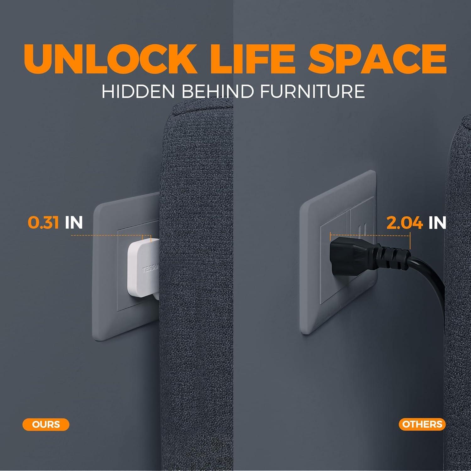 Space Saving Flat Plug: with only 0.35 inch ultra slim design, flat wall plug is much thinner than traditional plugs, which can close to the wall easily, and hide in the back of furniture, bed or refrigerator, no waste for every inch space for your home