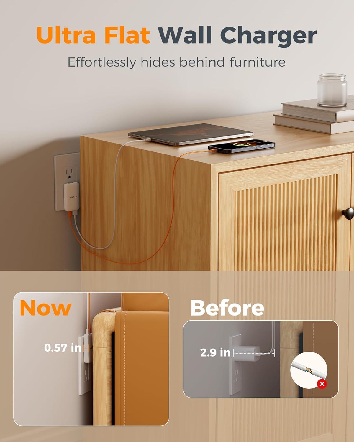 Ultra Flat Charging Block: Slim USB C wall charger is 0.57 inches thick, saving 4 times the space compared to traditional charger; Flat USB C wall charger easily fits into narrow spaces, such as behind sofas, beds, and other furniture, without blocking the outlets above
