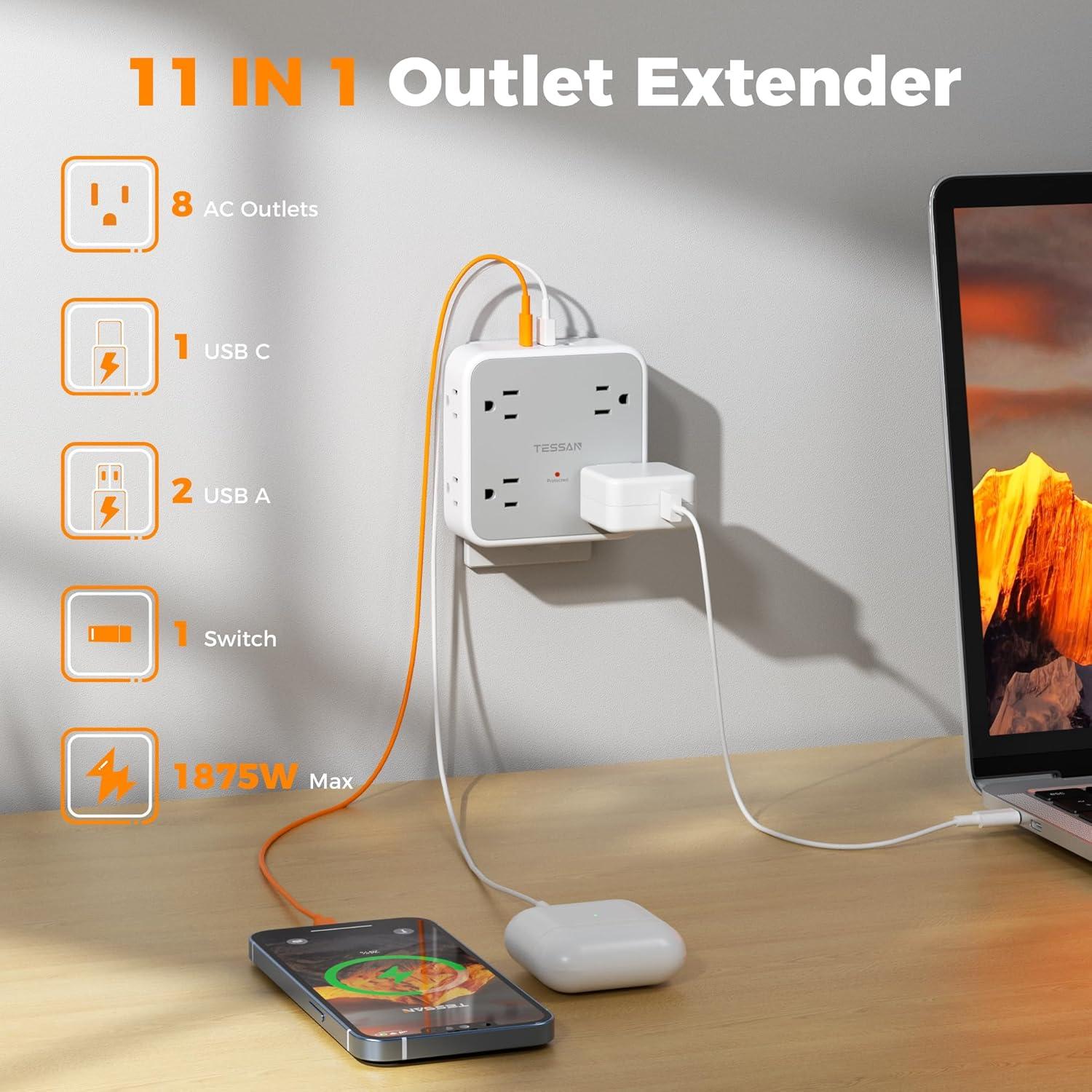 11 in 1 Splitter Plug Outlet: The multi outlet adapter wall plug can be expanded to 8 AC outlets (1875W Max), 1 USB C and 2 USB A ports, it can charge 11 devices simultaneously; You can use electrical outlet extender in many indoor place