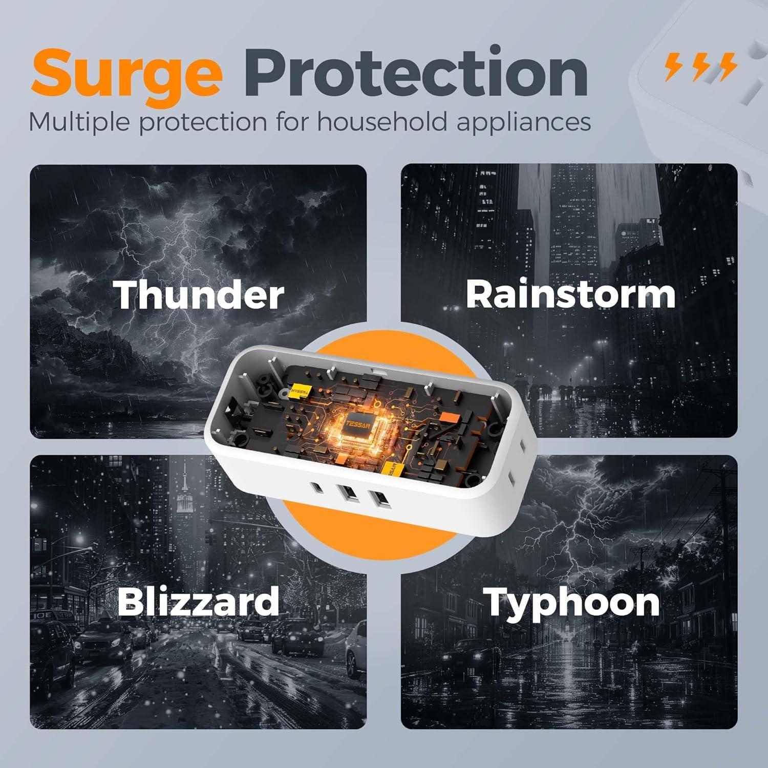 Surge Protection: The power of the wall outlet expander ranges 125V 15A,1875W max; Wall outlet surge protector can protect your electronics from surges and spikes disturbances