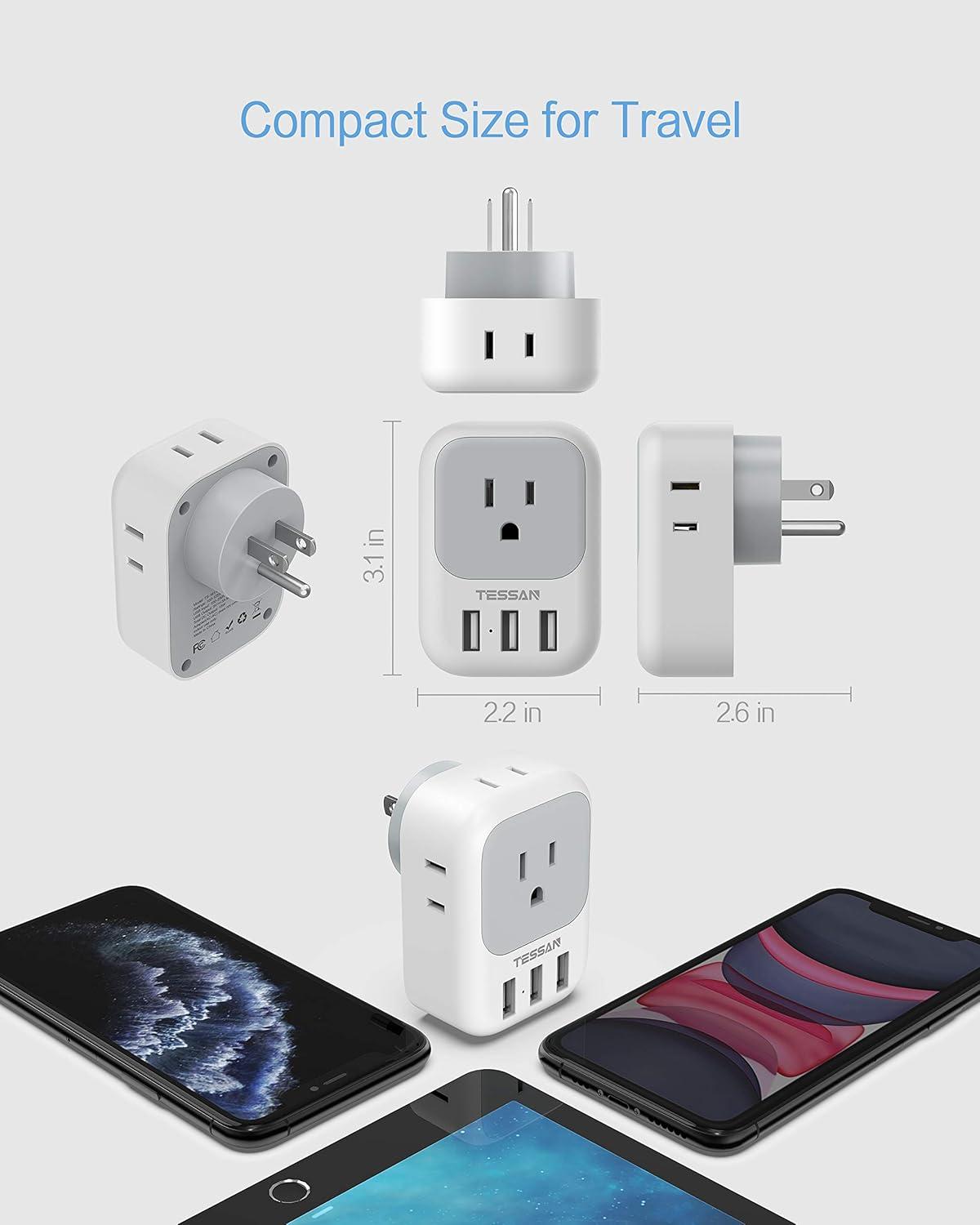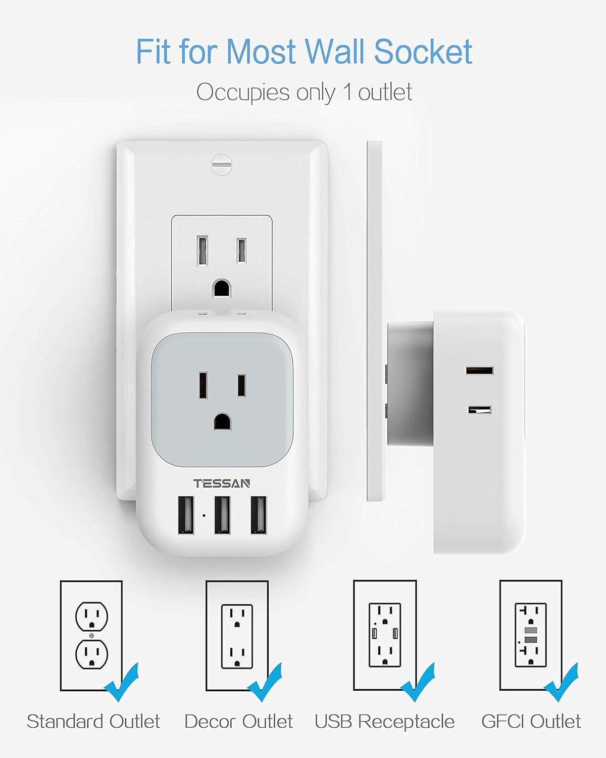 Electrical Outlet Extender: TESSAN USB wall plug make 1 socket turn into 4 electrical outlets and accept 4 bulky plugs at once without blocking each other; The multiple plug outlet has an electrical rating of 1250W (125V 10A)