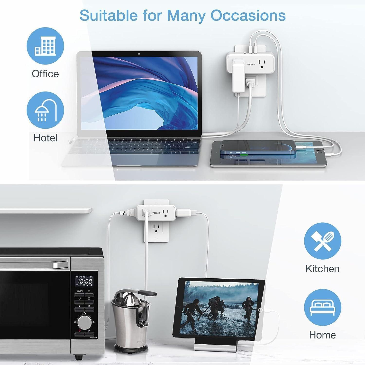 Space Saving: TESSAN USB plug adapter for wall outlet has a compact size and won't block the use of below sockets when plugged in; Electrical outlet extender can fits in tight spaces, keeping your desktop clean and home comfortable