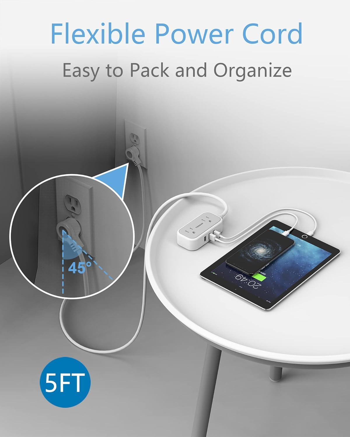 5 in 1 Travel Power Strip: This flat extension cord 5ft could turn 1 socket into 2 AC outlets and 3 USB ports, charge 5 devices simultaneously without blocking, keep your desktop organized; You can use it in any indoor place such as home, office, dorm room or cruise