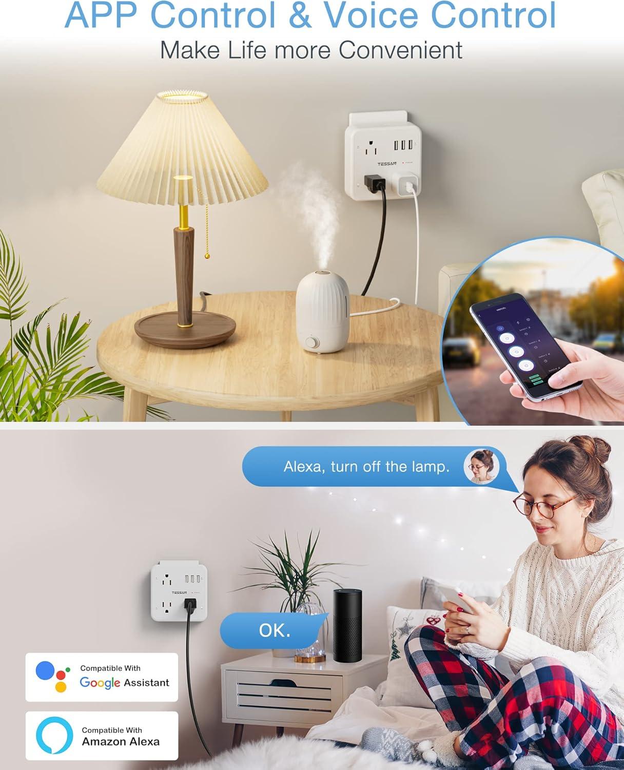 Voice Control & APP Remote Control: TESSAN smart plug extender is compatible with Alexa and Google Assistant to turn your appliance on or off with a simple voice command; Also can control your device easily away from home with Smart Life APP; (Note: This smart plug only supports 2.4GHz Wi-Fi network)