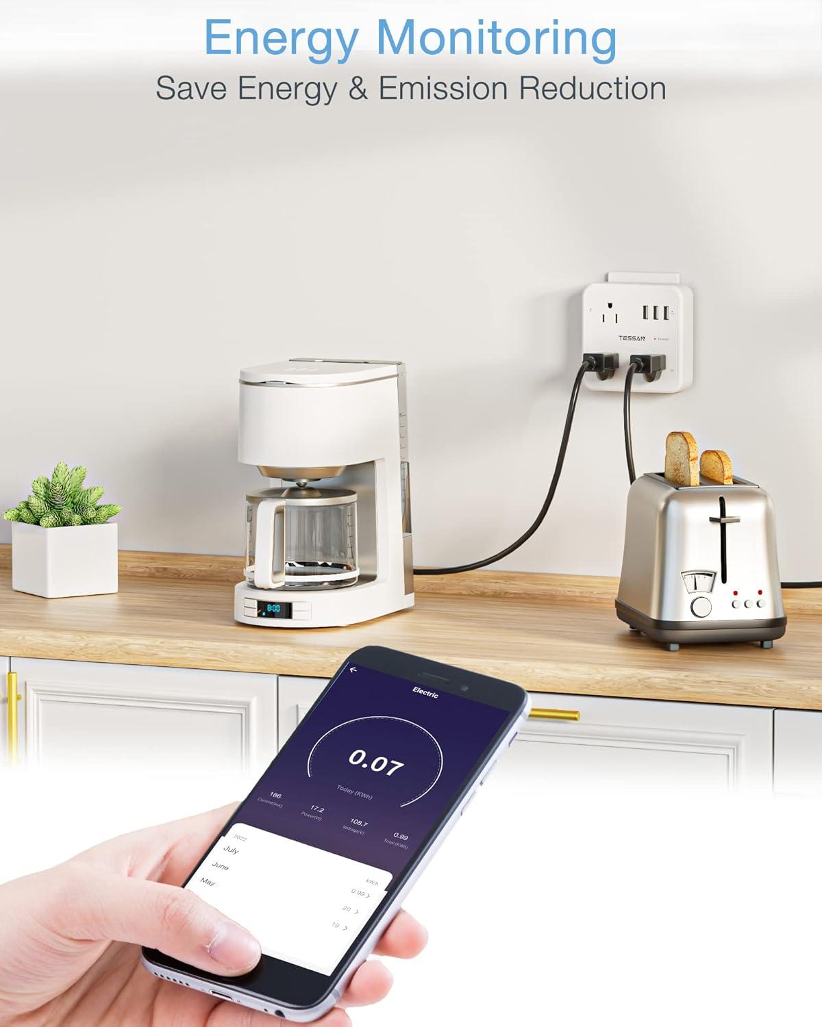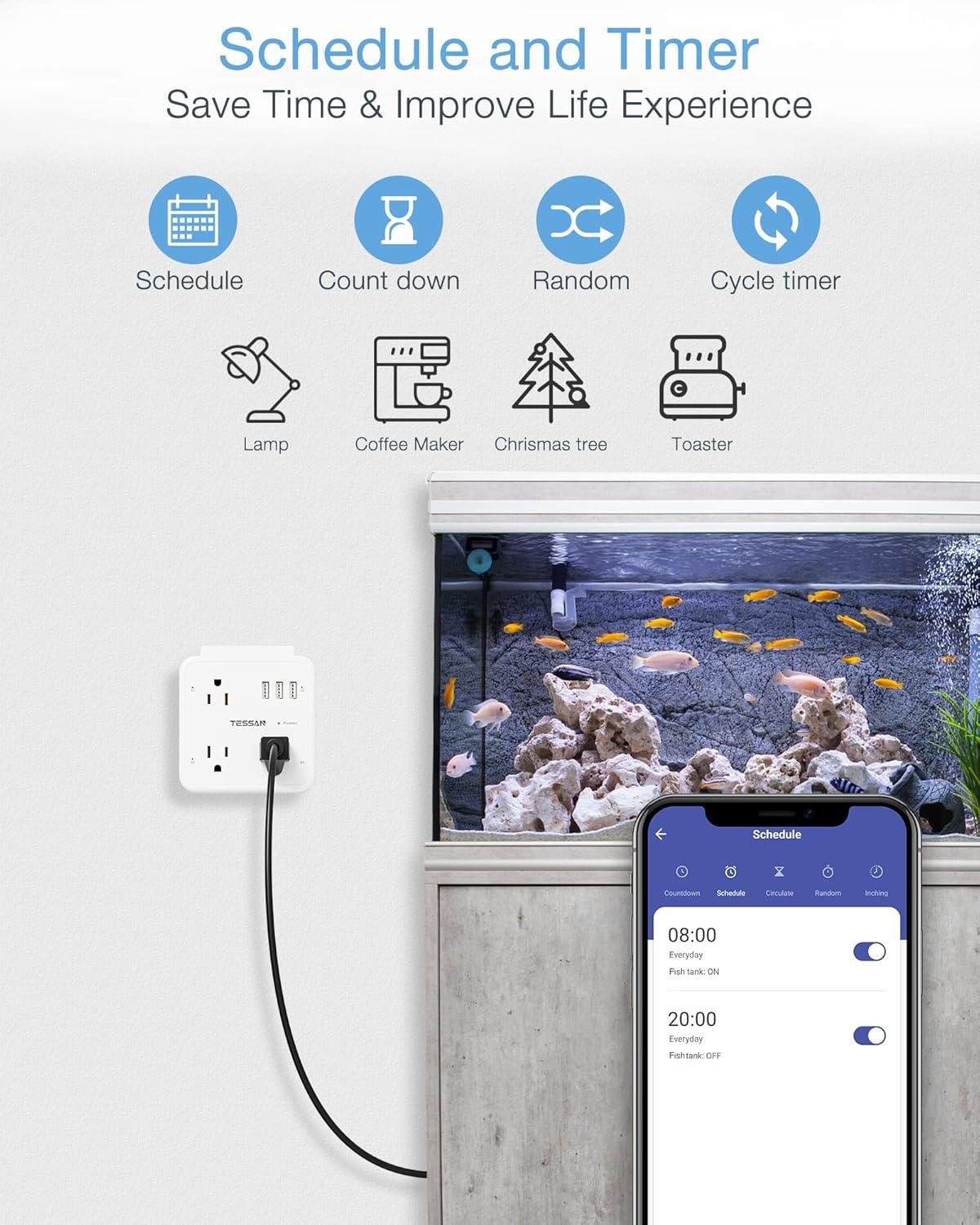 Schedule and Timer: Tessan smart outlet plug can automatically turn on/off the devices by customized schedules, such as Christmas lights, lamps, humidifiers, fans, coffee makers, and other home electronic appliances