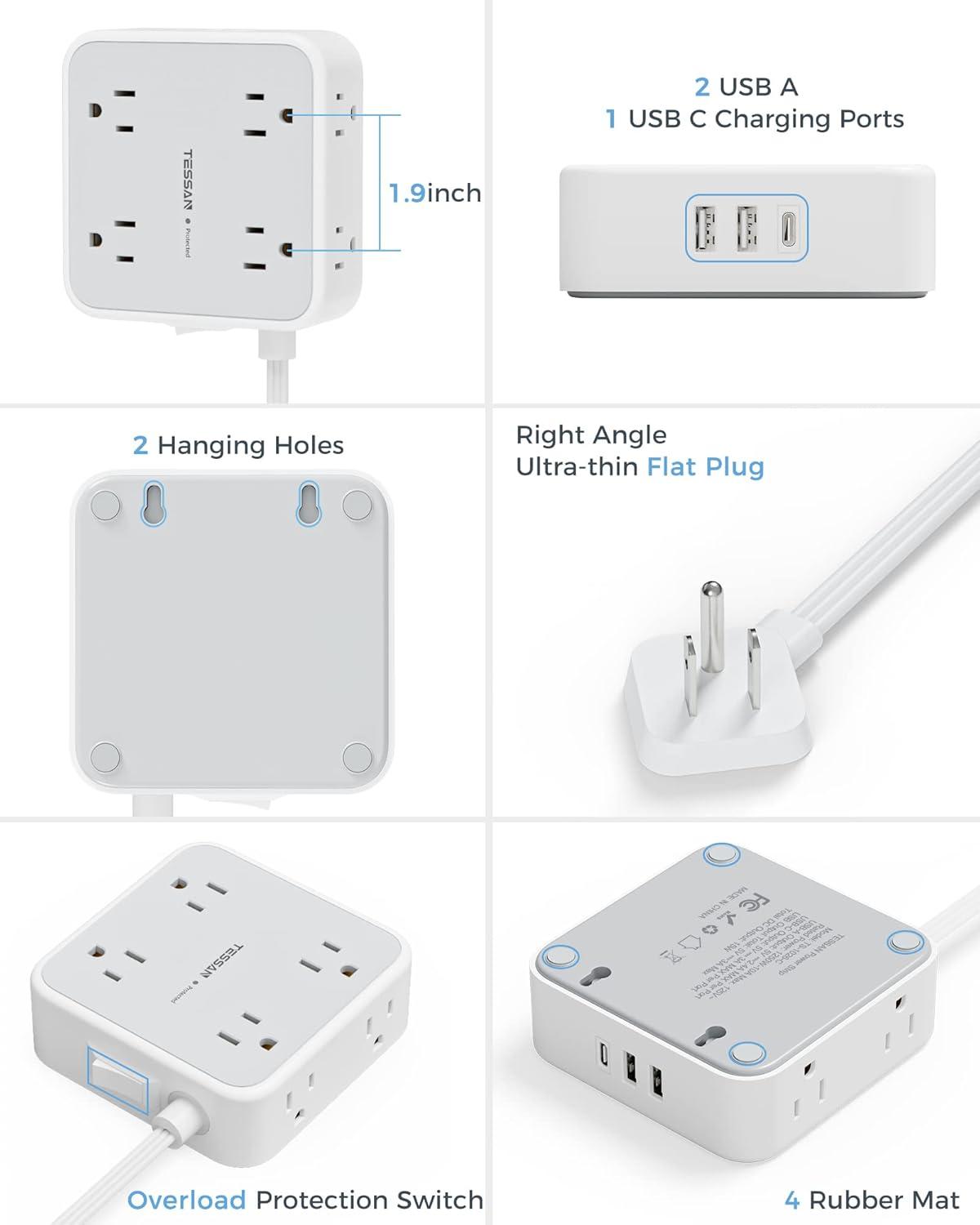 Power Strip with USB C: Dual USB A ports features 2.4A, the USB C port features 3A; 2 types of USB ports can detect charged devices and deliver optimal charging speed, giving you more charging options; idea for USB devices like cell phone, tablet, earphone, etc