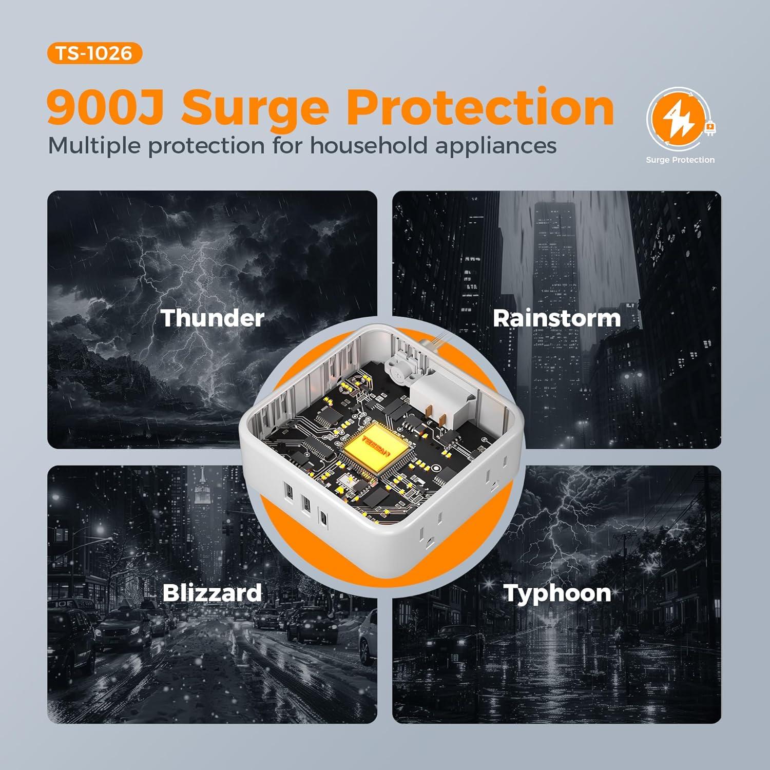 900J Surge Protector Outlet: Equipped with overload protection, short circuit protection; On/Off switch can automatically shut off to protect your electronics; Power strips with surge protection providing you with a safe and reliable charging environment