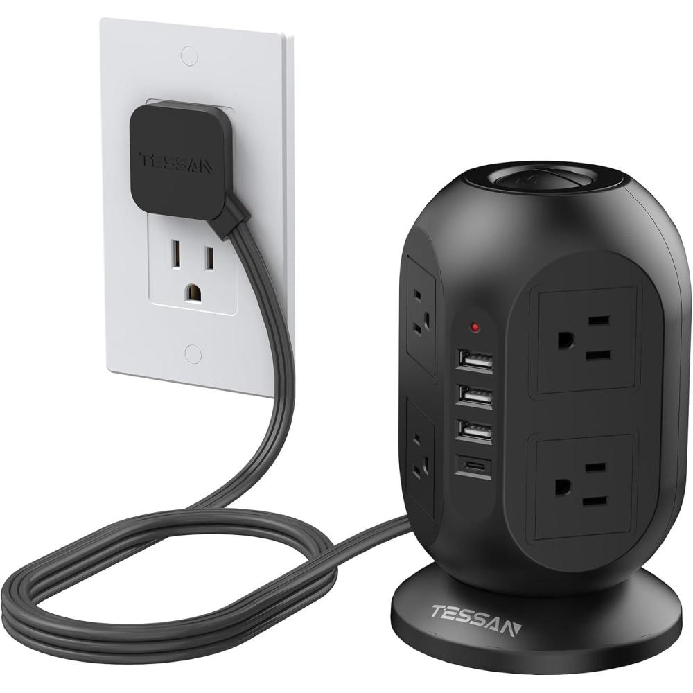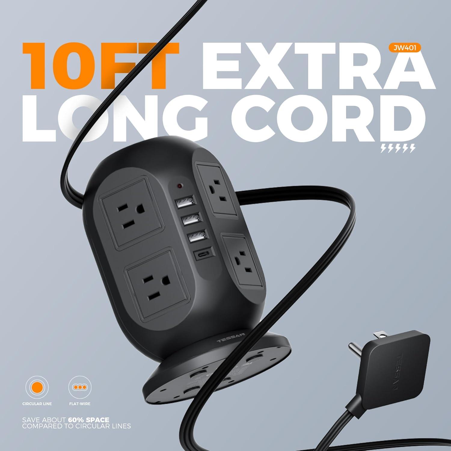 Space Saving Design: 4-side compact design tower power strip takes up little space on your desk, cleans various cords and create a neat and tidy space; Stable base with 4 rubber feet at the bottom, efficiently keeps this 10 foot extension cord from slipping and sliding