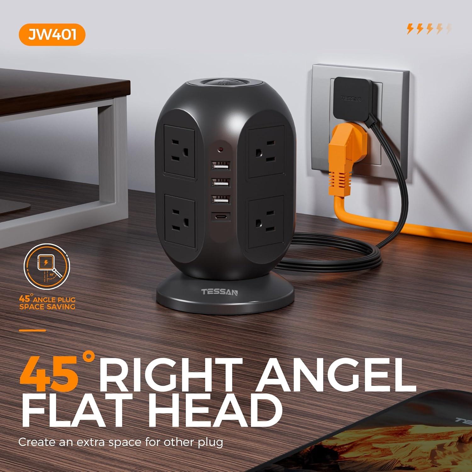 Flat Extension Cord 10ft: With only 0.31 in ultra thin flat head design, power tower with usb ports can easily fit in tight spots and hide behind sofa, bed, nightstand or other furniture, sitting flush against the wall; 45 degree right angle design create an extra space for other plug below without blocking