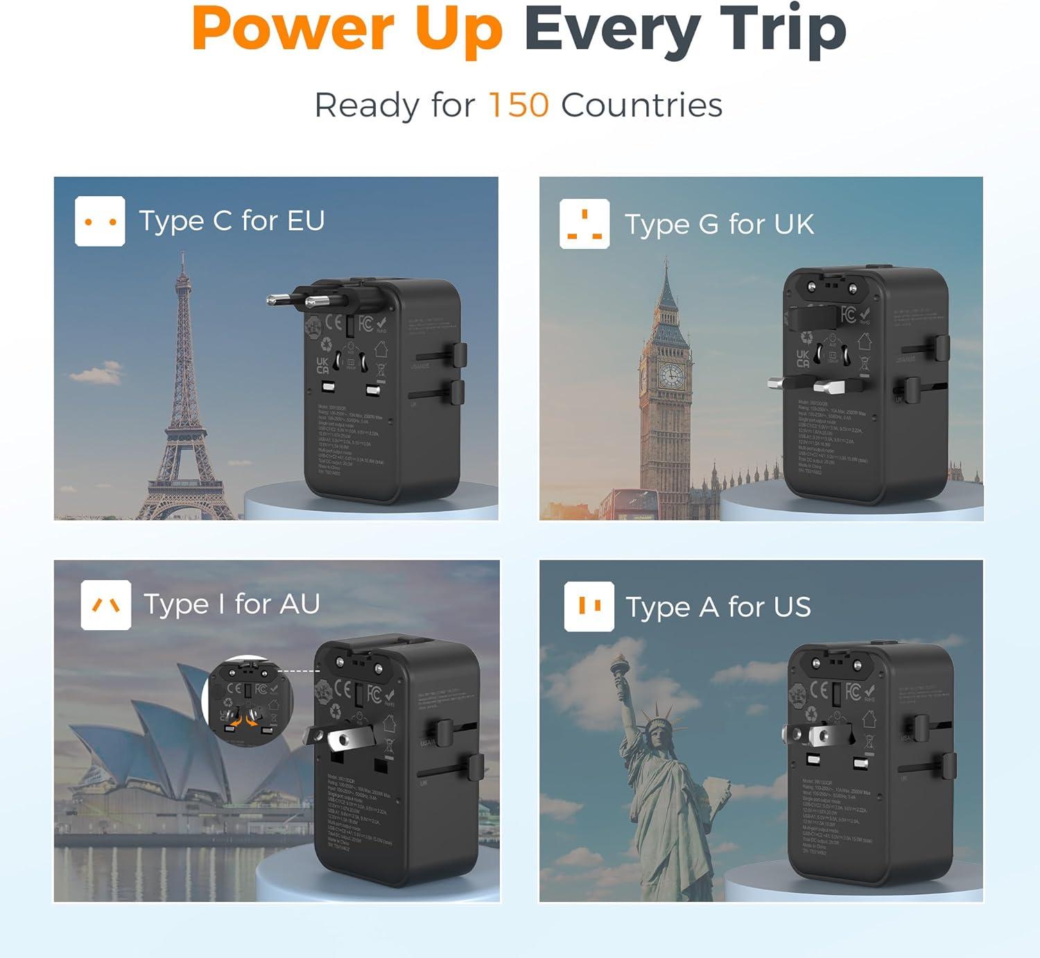20W International Travel Adapter: Dual USB-C ports of the universal adapter deliver up to 20W when used individually, saving charging time; USB A port feature 18W max, 2 types of USB ports meet different charging needs; All the USB ports output: 15W max