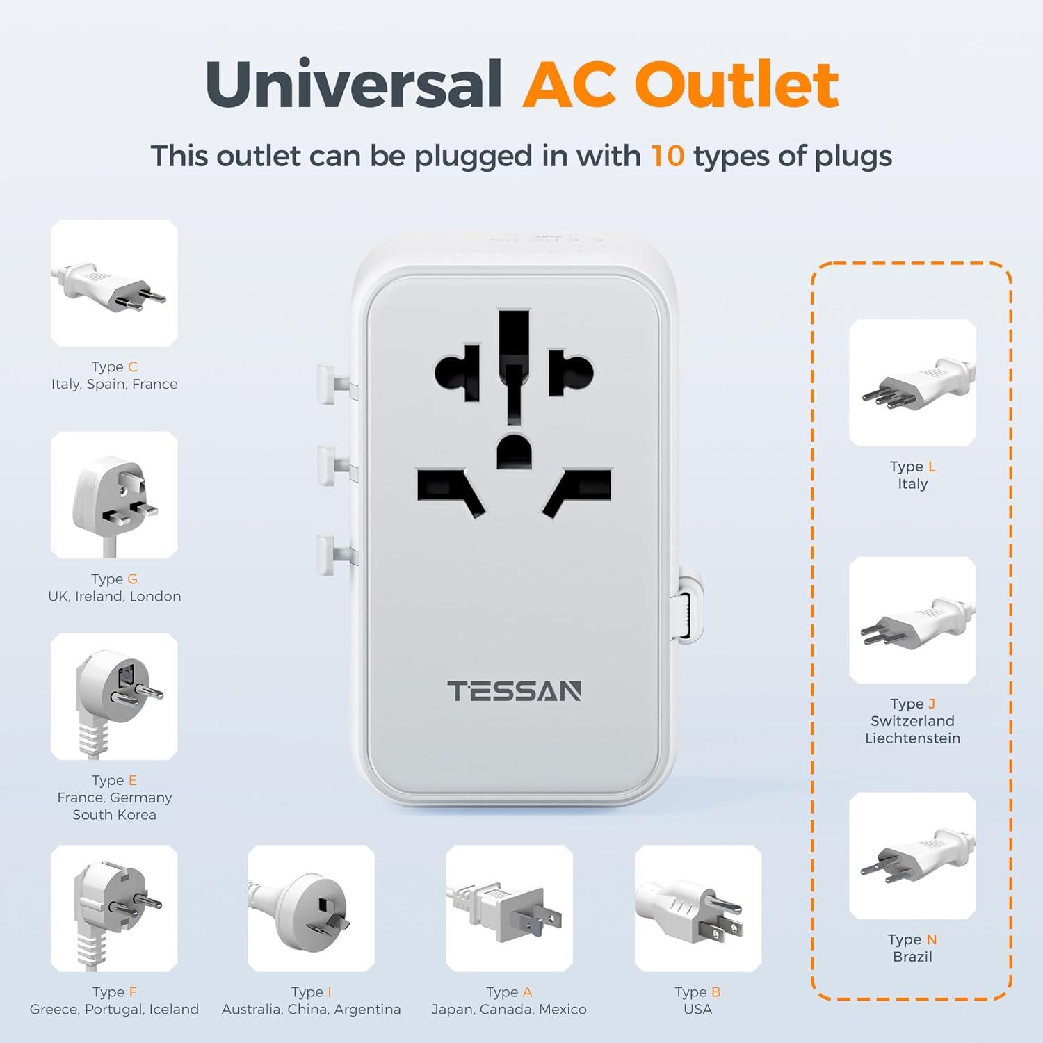 Universal Power Adapter: TESSAN travel adapter covers over 150 countries: Type C for most of Europe Italy, Spain, France, Germany, Thailand; Type G for UK, Ireland, Scotland; Type I for Australia, New Zealand, Fiji, China; Type A for Japan, USA, Mexico
