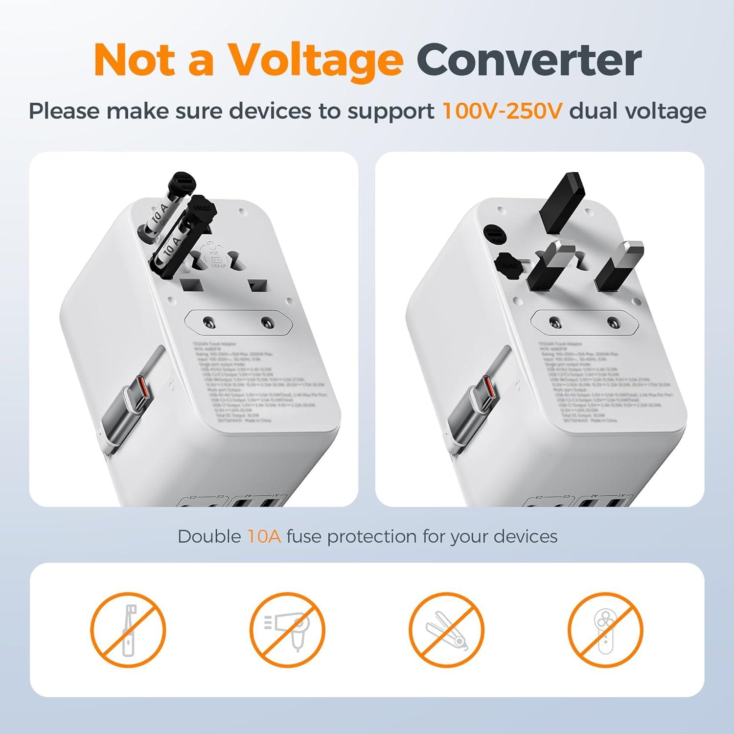 Ultra-Slim and Safe: The universal adapter for travel measures 3.14×1.97×1.31 inches, weighs 3.9 ounces, saving suitcase space; This UK adapters for travel has no surge protection, suitable for cruise ships. Built with a 10A fuse for overload protection