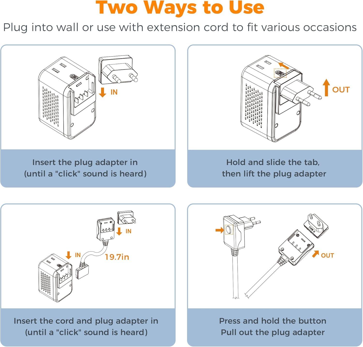 Compact and Safe Design: This voltage converter for European travel with a lightweight and portable size(3.15*1.93*2.17 in), provides overload, overcurrent and short-circuit protections. The European voltage converter operates silently without disturbance