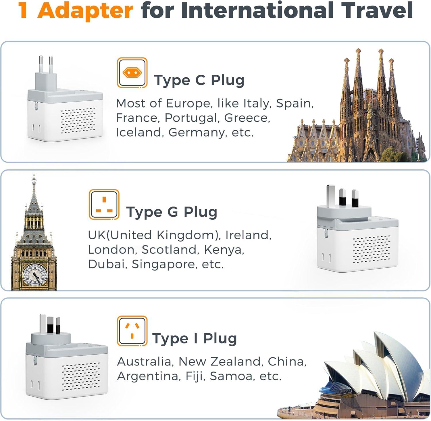 Travel Voltage Converter: The power converter for Europe is equipped with 1 power cable and 3 international adapters (Type C, G, I). This adapter plug converter works in Europe, Italy, Spain, Iceland, Portugal, Greece, UK, Ireland, Australia, New Zealand
