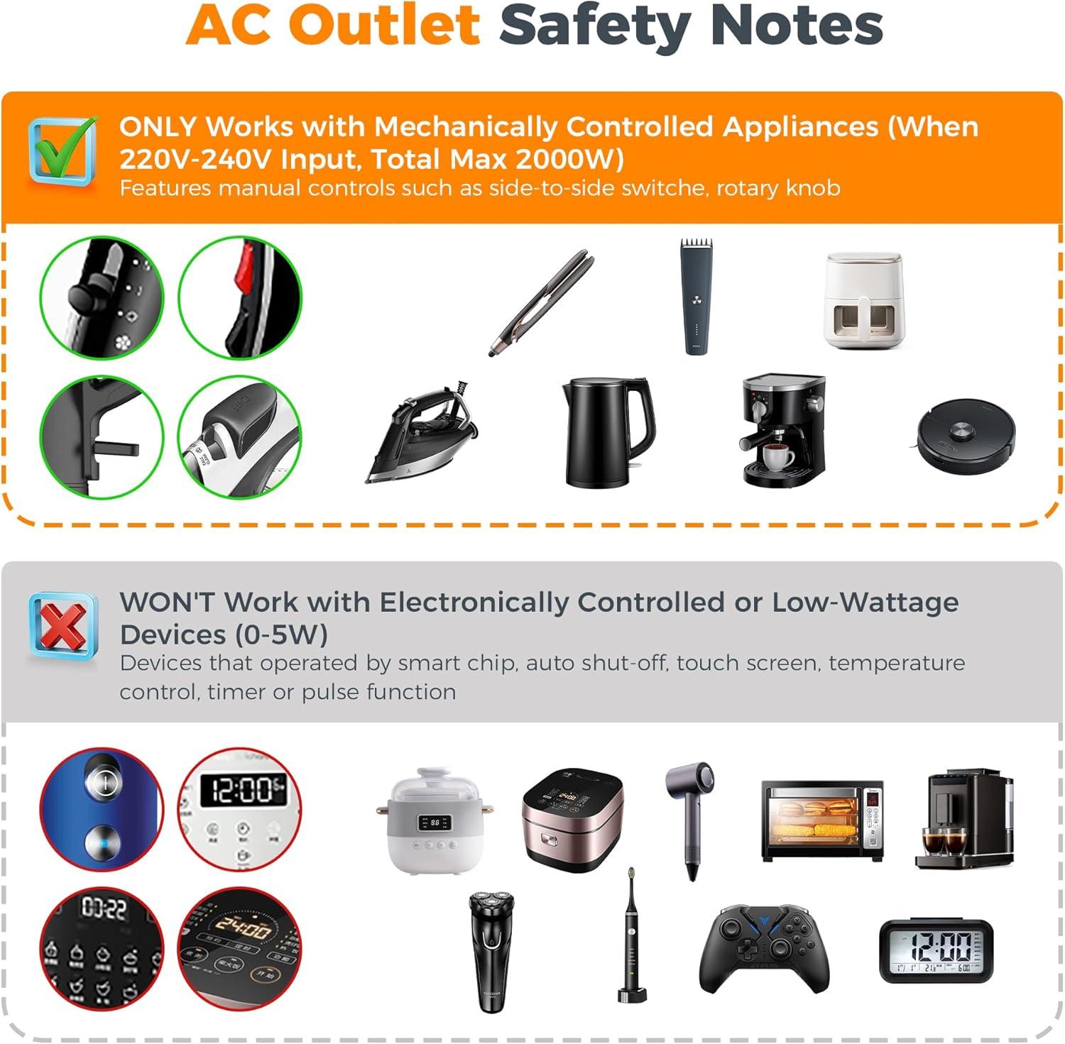 Note: AC outlets of the voltage converter 220 to 110 are designed for simple mechanical motors but are not suitable for low-wattage devices (0–5W), such as electric shavers or toothbrushes. Before use, ensure that you check safety instructions for devices