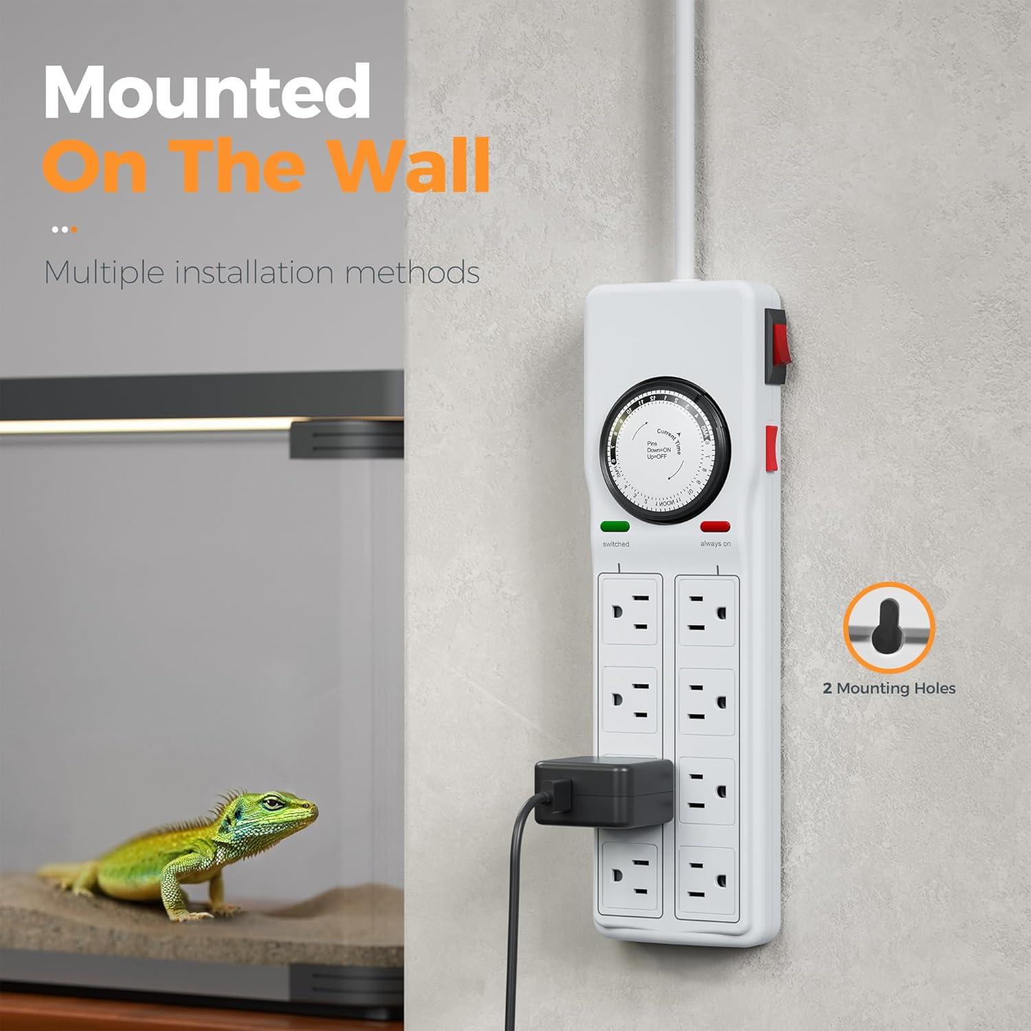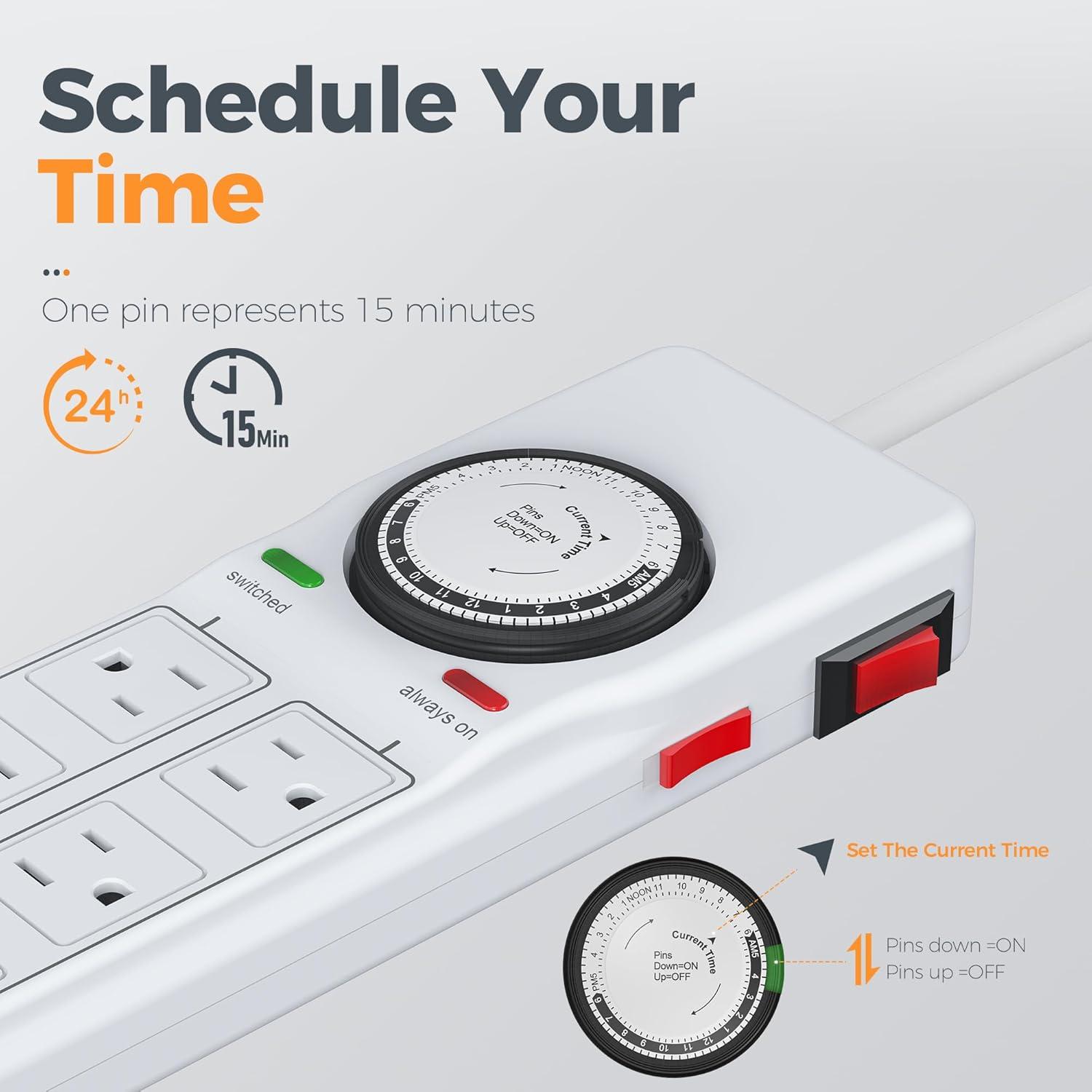 Mechanical Timer Power Strip: The timer outlet can plan daily, equipped with 4 AC outlets for timing, 4 AC outlets are always powered, and can connect 8 devices simultaneously; The timer pin dial can be set in increments as low as 15 min