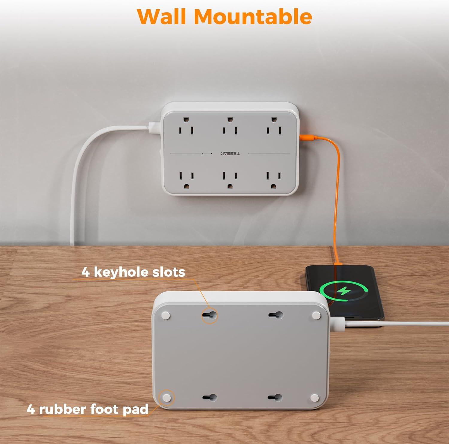 imageTESSAN Flat Extension Cord 10 FT with Flat Plug Power Strip Small Extension Cord with 6 AC Outlet 1 USB C and 2 USB A 1080J Surge Protector Power Strip Wall Mount for Dorm Room Office HomeGray