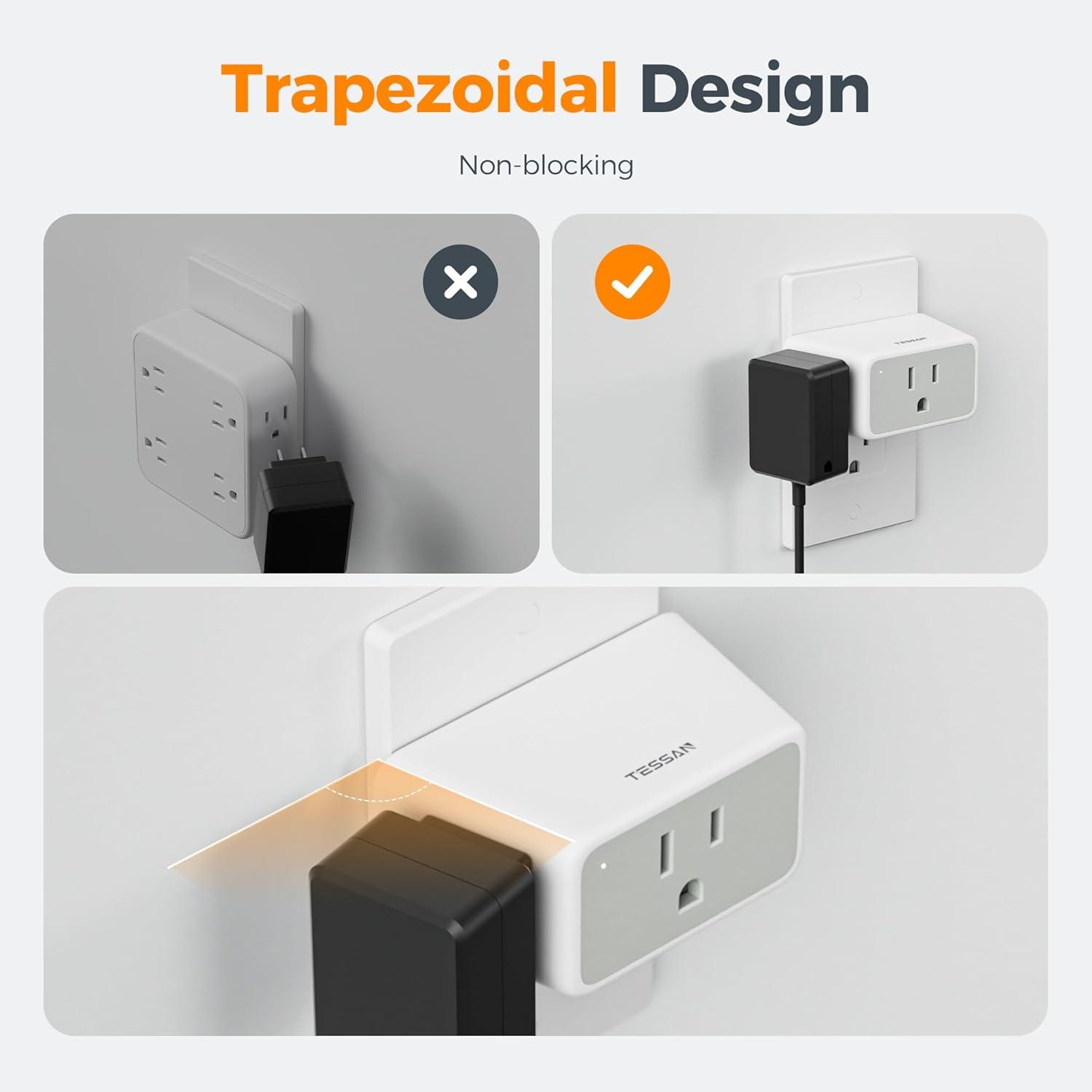 3-Sided Design for Space Saving:The 3-sided structure fits 3 large plugs simultaneously without blocking each other; The trapezoidal shape makes plug extension outlet easy to power multiple devices in spaces with limited outlets, such as bedrooms and living rooms