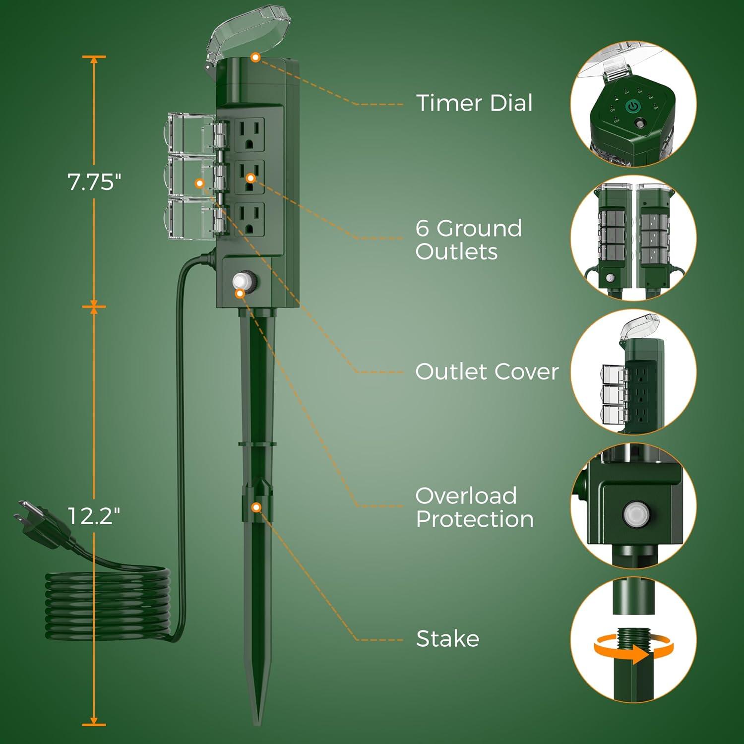 Simple Installation and Outdoor Stake: Green outdoor stake timer comes with a thicker and tougher stake that let you plug it into hard earth and lawn easily; Set up headlights, porch lights, outdoor string lights, landscape lighting, seasonal and holiday decorations with the 6 sockets outdoor power strip simply