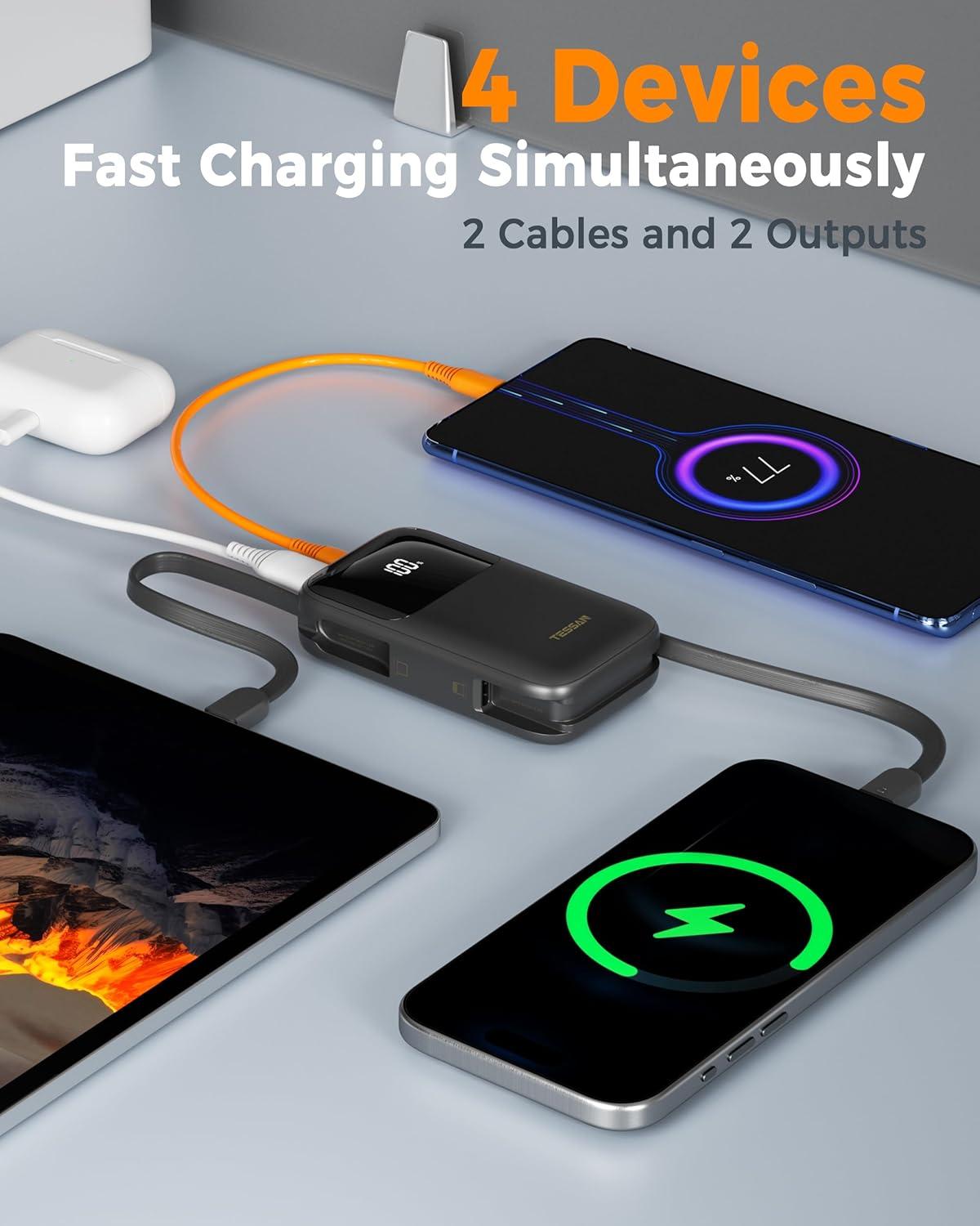 Portable Phone Charger Built in Cable: Conveniently charge your devices and the power bank for iphone itself with built-in cables and USB-C port. Use the integrated USB-C and lighting cables for iphone to charge your phones,laptops and tablets ,TESSAN battery pack simplifying your charging routine.