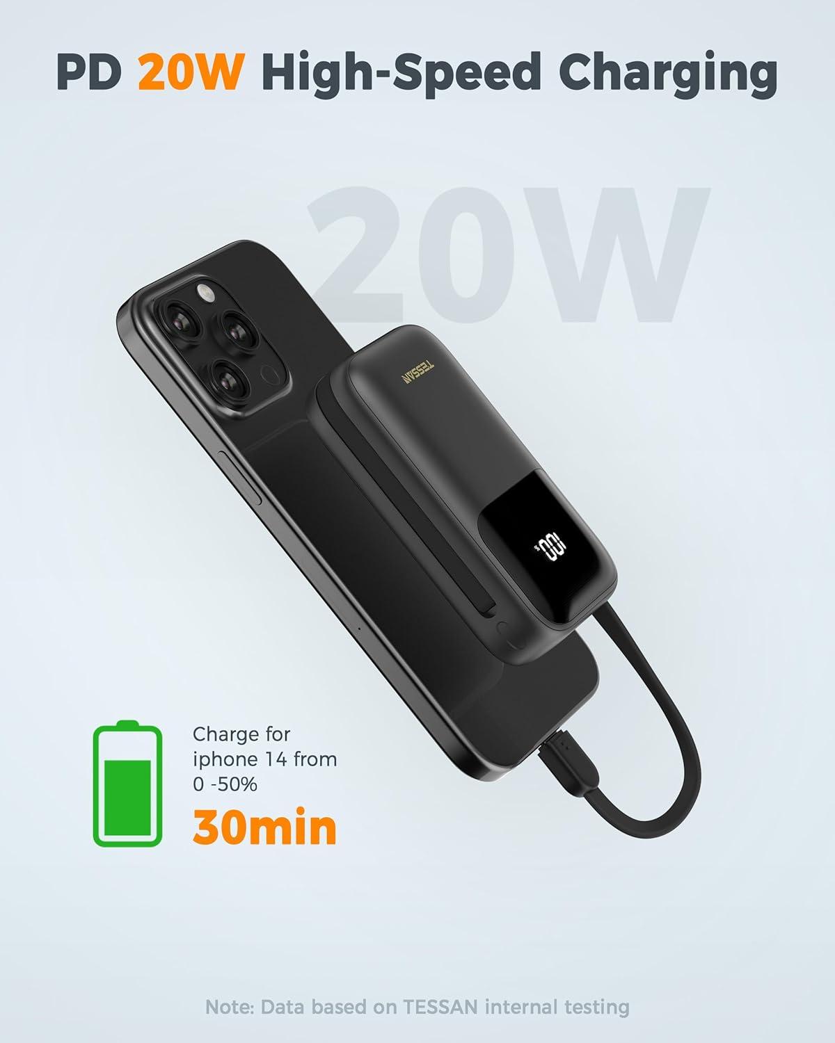 Fast Charging:TESSAN Portable charger with 20W PD fast charging to charge your phone to 50% within 30 minutes(for iphone 14). Recharge the portable charger power bank to 50% in just 45 minutes and fully recharge in 2 hours.Keep your devices powered all the time.