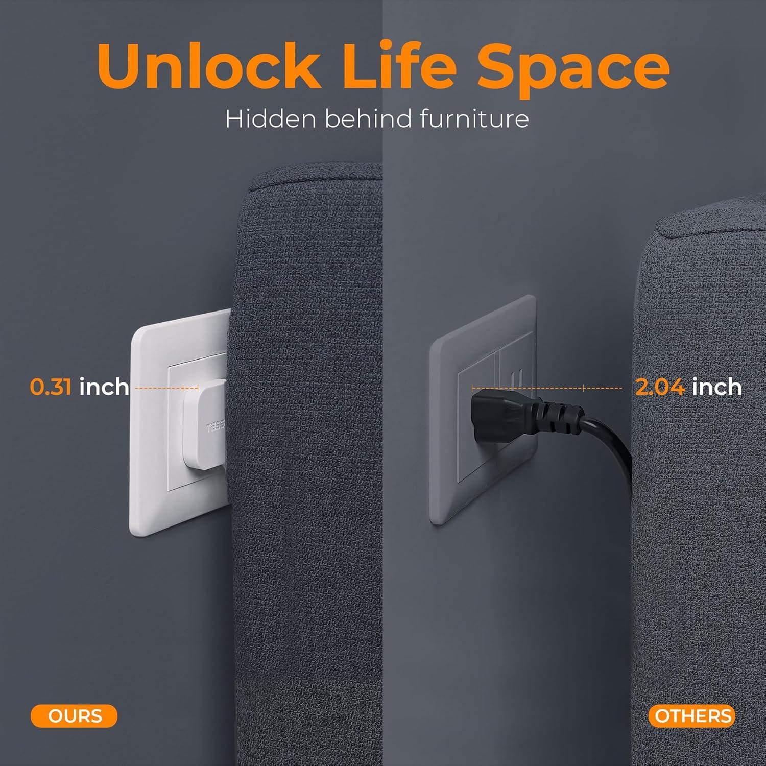 Flat Extension Cord 6FT: With only 0.31 in ultra thin flat head design, flat plug power strip can easily fit in tight spots and hide behind sofa, bed, nightstand or other furniture, sitting flush against the wall; 45° right angle design create an extra space for other plug below without blocking