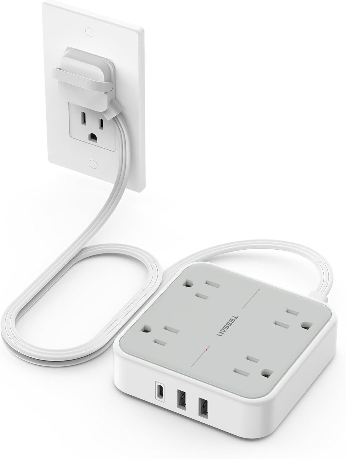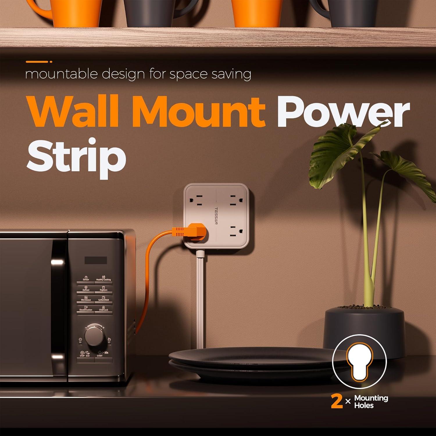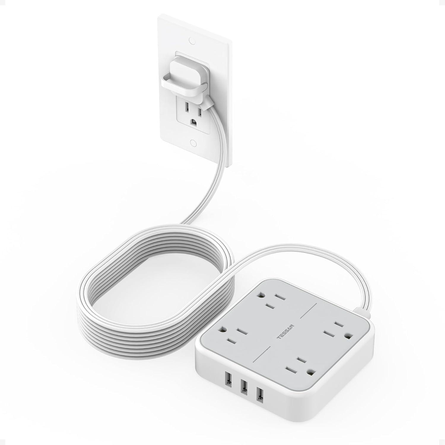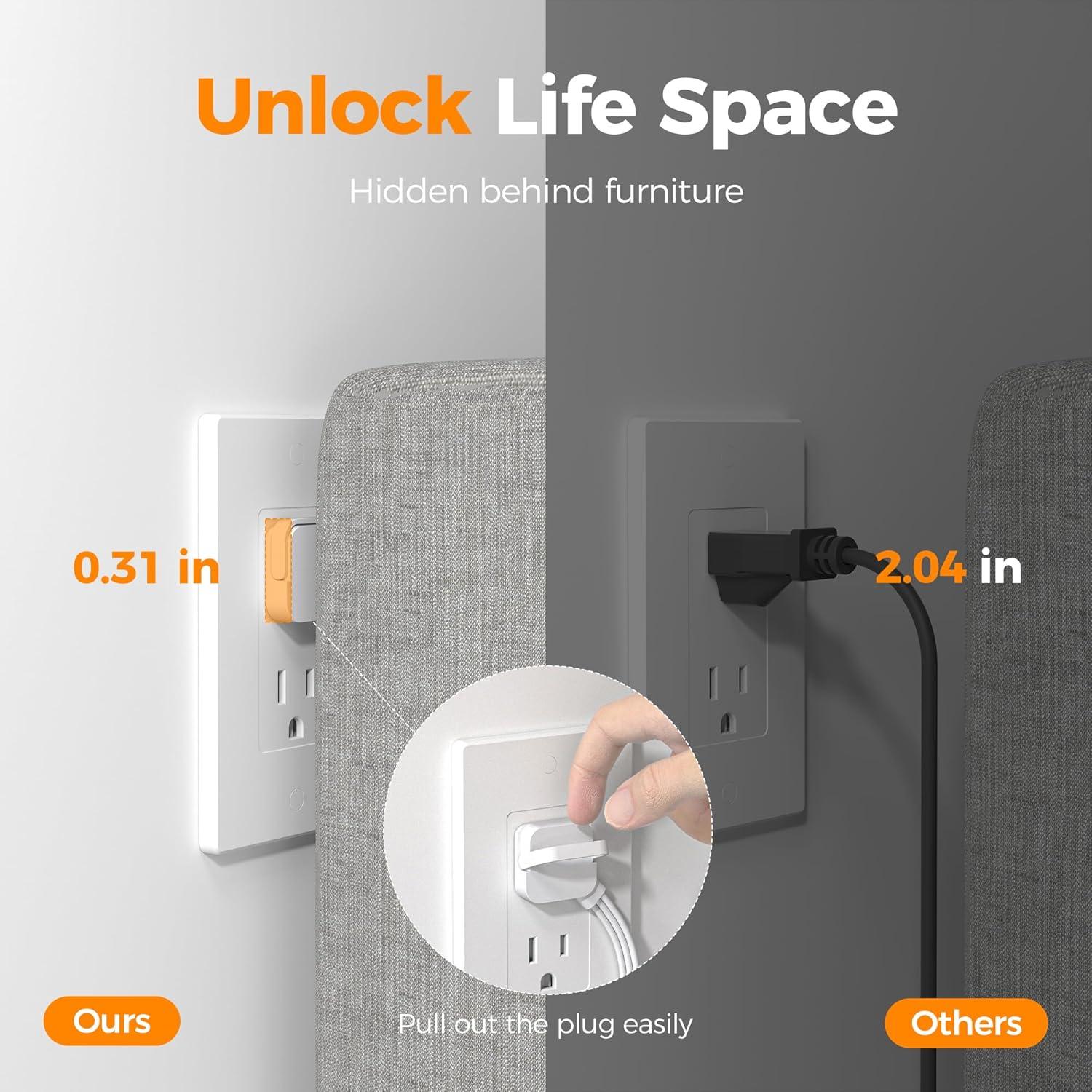 Easily Pull Out Flat Plug: TESSAN 0.35 inches ultra thin flat head includes a built in pull ring for easy unplugging in tight spaces like behind TV or sofa; The design make this flat plug power strip inserted or removed effortless and safe