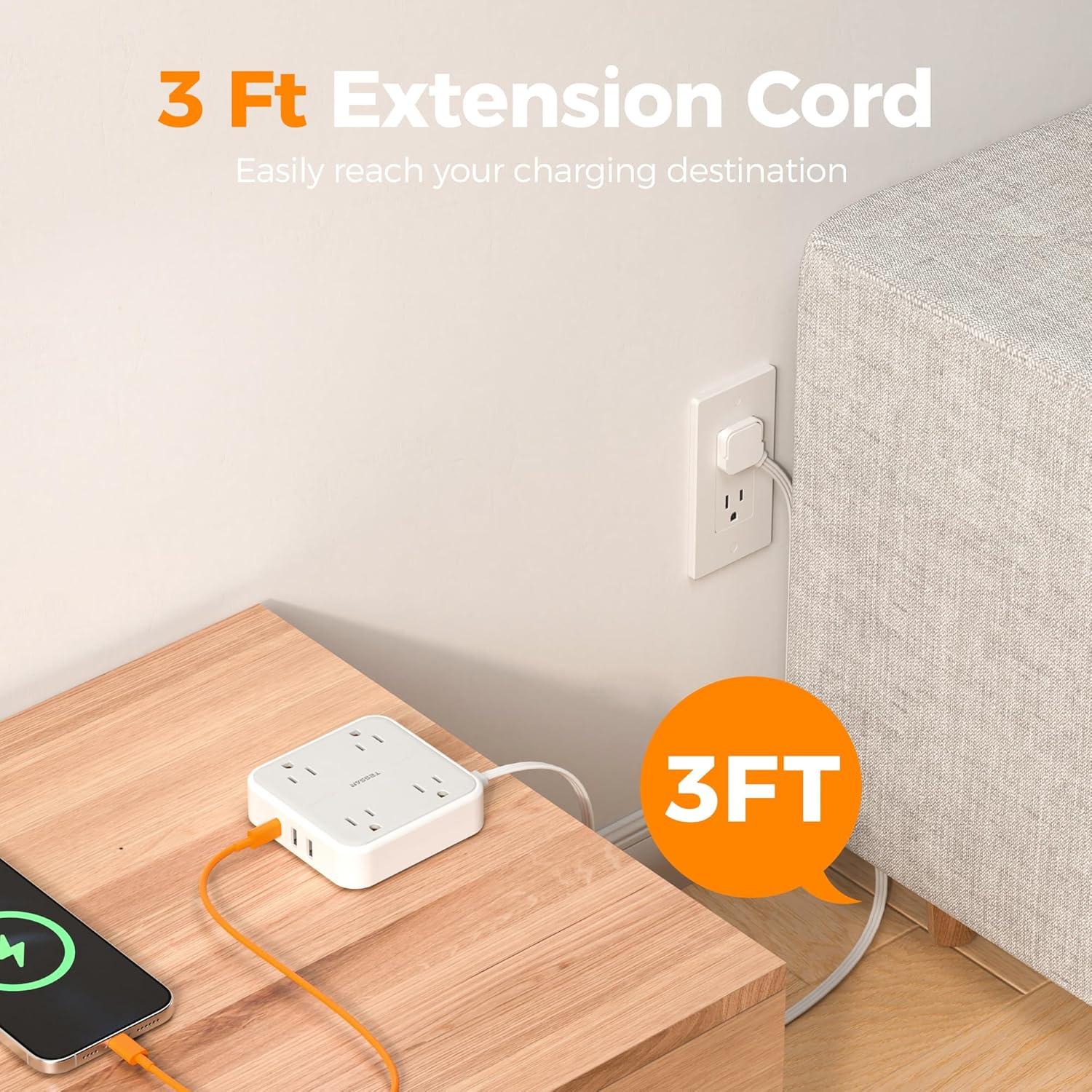 7 in 1 Flat Power Strip: USB power strip can be expanded to 4 AC Outlets (1250W Max), 1 USB C and 2 USB A; Surge protector power strip with flat head extension cord 3 Ft can charge 7 devices at the same time, reducing waiting time