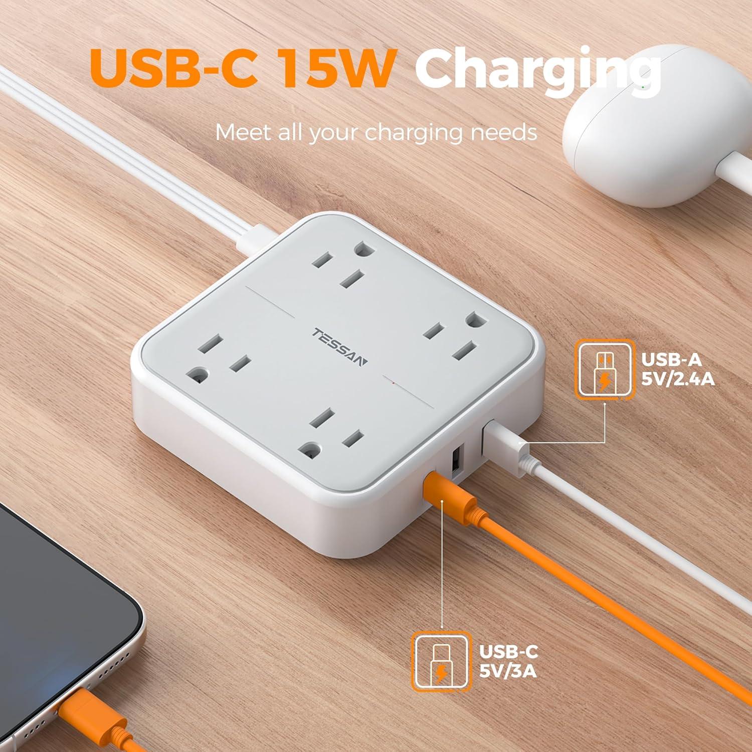 1 USB C and 2 USB A Ports: The power strip with USB ports features 1 USB C (5V 3A, 15W Max), 2 USB A delivers 5V 2.4A, 12W Max per port, This flat plug extension cord is suitable for phone, tablet, and other devices