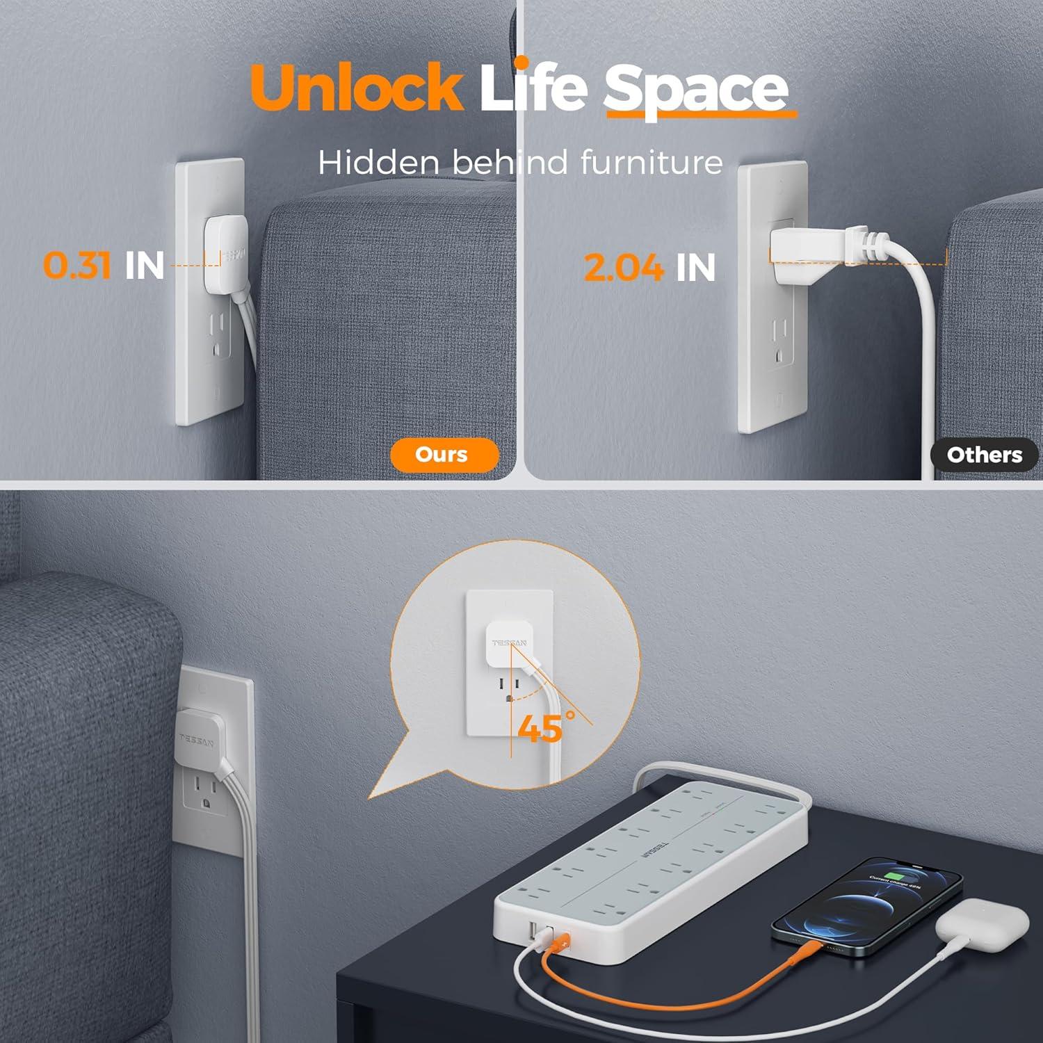 Flat Extension Cord: Featuring an ultra 0.31in flat head design, 5ft extension cord flat wall plug can fit in tight spaces and hide behind sofa, nightstand or other furniture; 45 degree angle design create an extra space for other plug below without blocking
