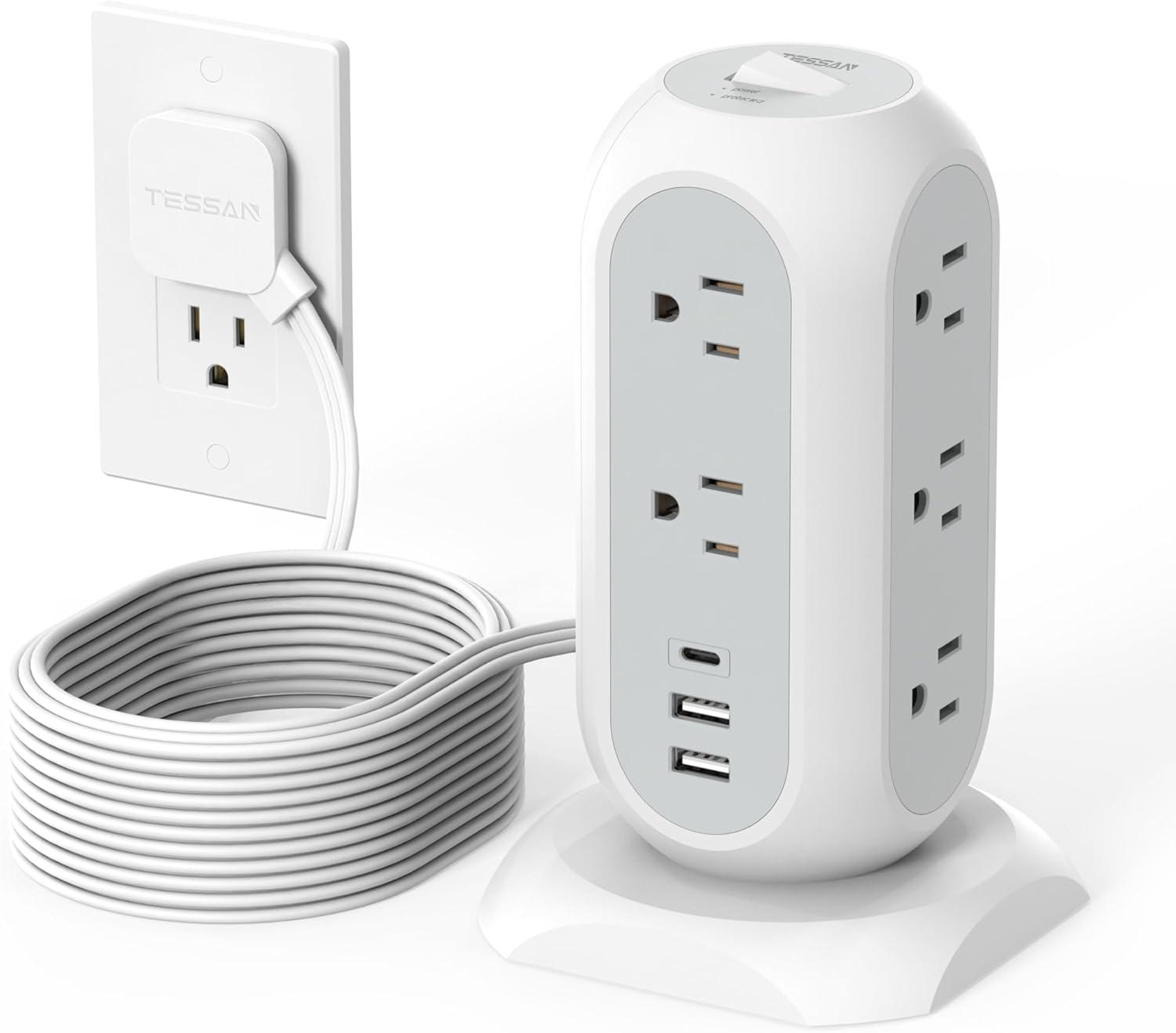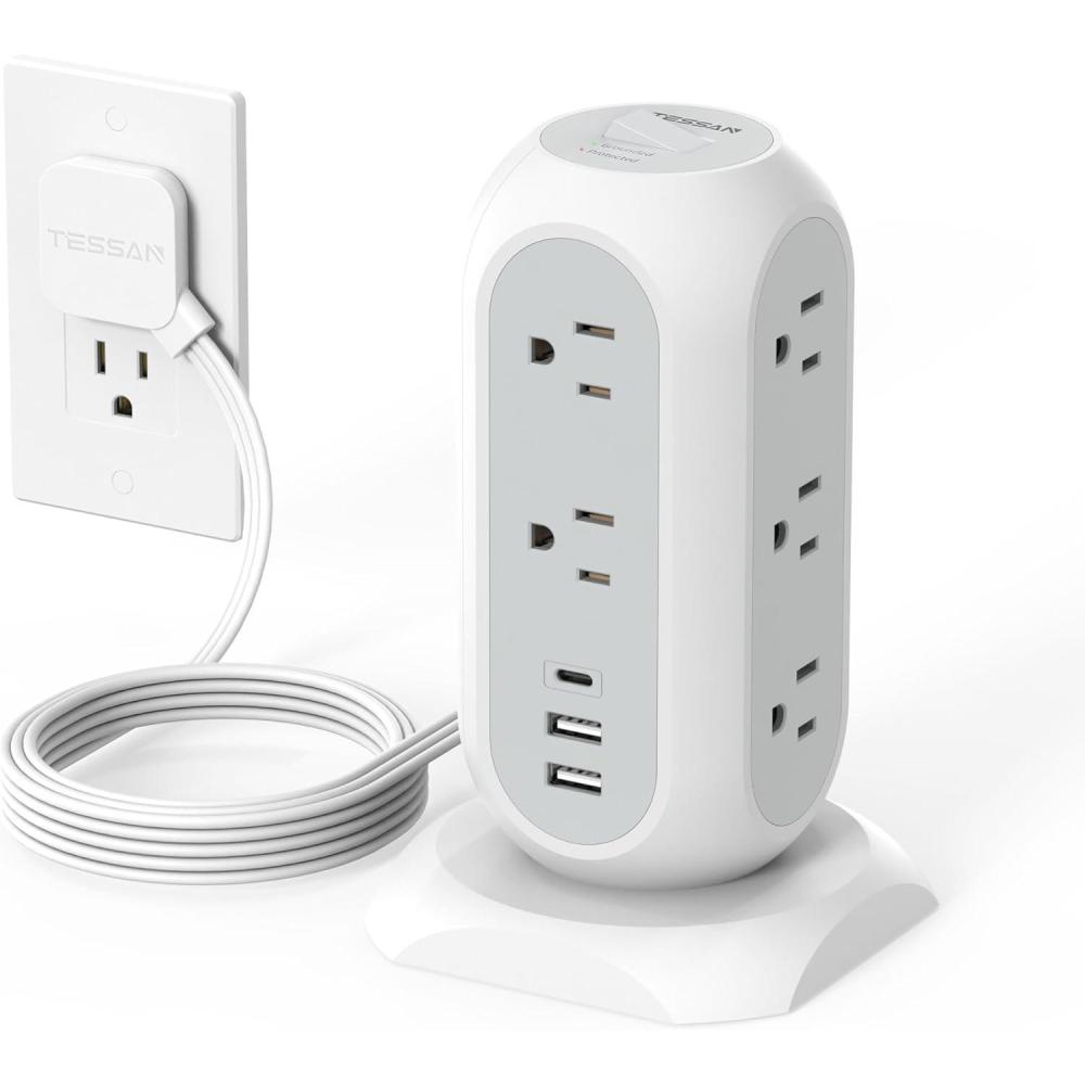14 IN 1 Power Strip Tower: TESSAN surge protector power strip tower has 11 outlets, and 3 USB ports. The multi-outlet plug tower supports a wide voltage of 100V-250V, with 15A heavy-duty 6ft extension cord rated 1875W. And 3 USB Ports total is 5V/ 3A. (5V/ 2.4A Max Per Port) This 14 in 1 power strip can be your charging station for multiple devices.