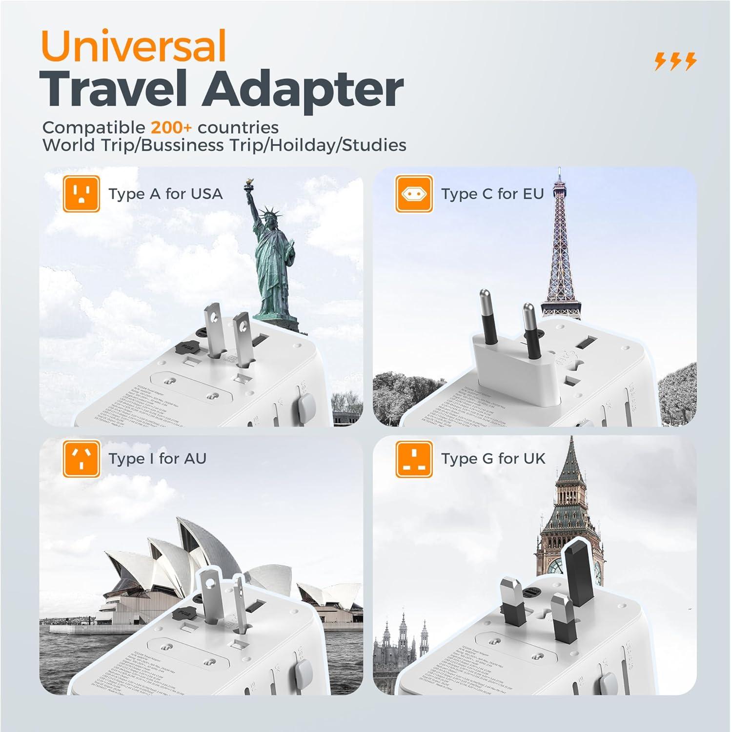 6 in 1 Universal Adapter for Travel: This universal plug adapter can turn 4 different socket into 1 universal AC outlet, 3 USB C and 2 USB A, charge 6 devices at a time; The universal outlet converts plugs of US, EU, UK, AU; TESSAN universal travel adapter can charge anywhere