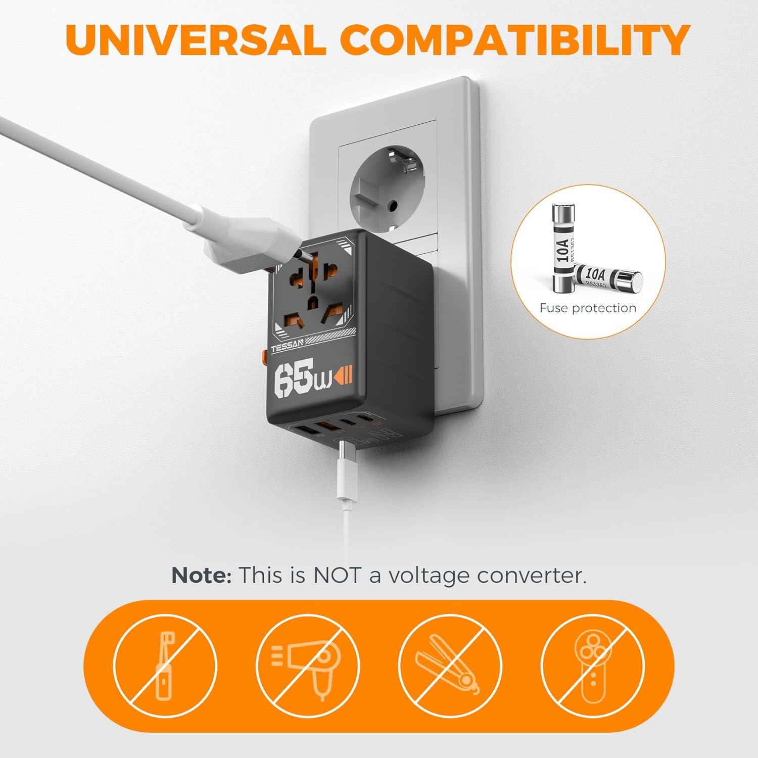 TESSAN Universal Travel Adapter, International Power Adapter with 4 USB Ports (1 USB C), Worldwide Plug Adaptor Wall Charger for USA to Europe UK France Germany Spain Ireland Australia(Type C/G/A/I)(Black-65W)
