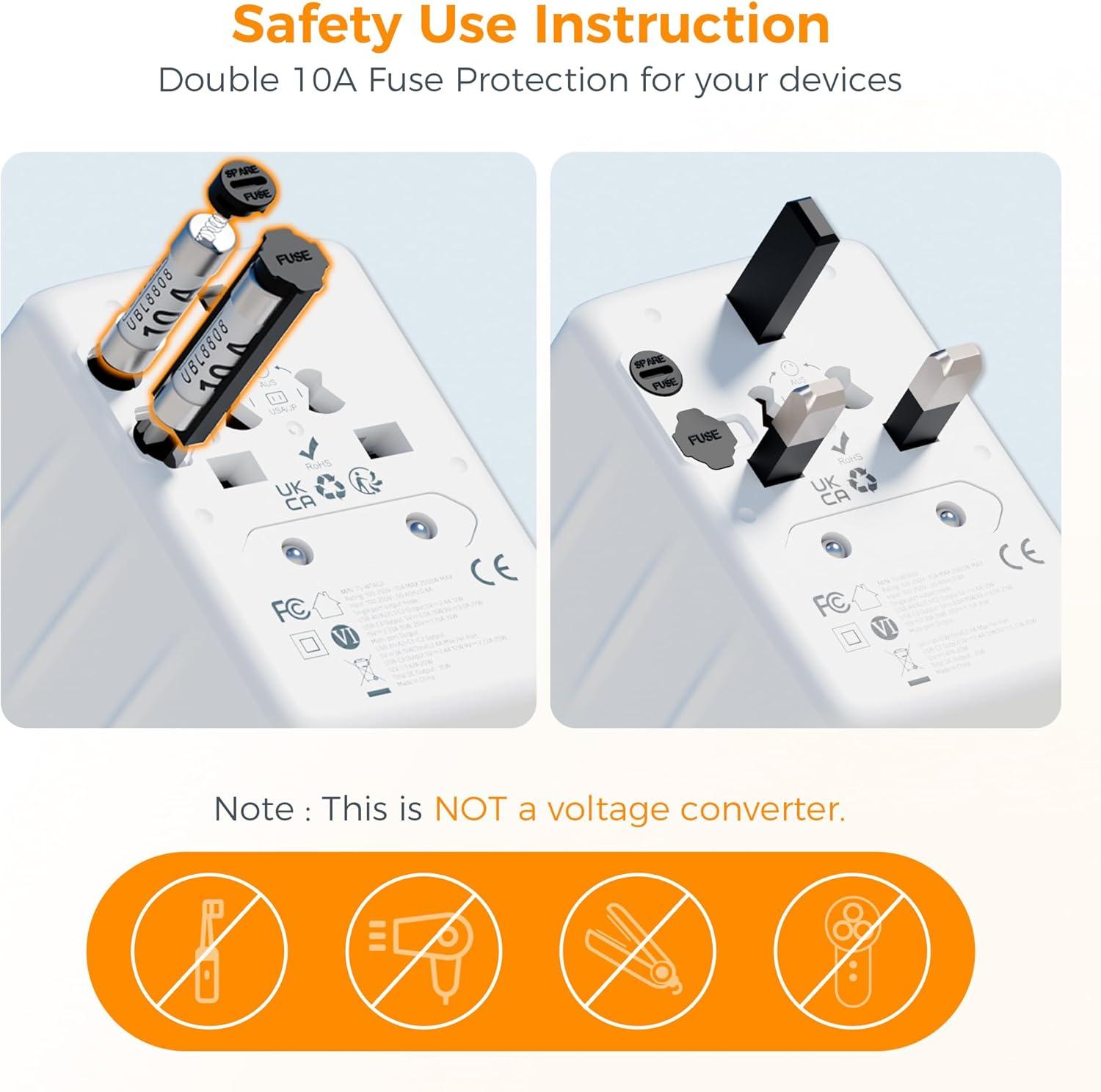 Portable and Safety: Compact and lightweight design to fit into luggage and briefcases; It has no surge protection, no cords, can be taken aboard cruise ship. The worldwide adapter with double fuse (fuse standard: 250V 10A), integrated security shutters, guard your travel security